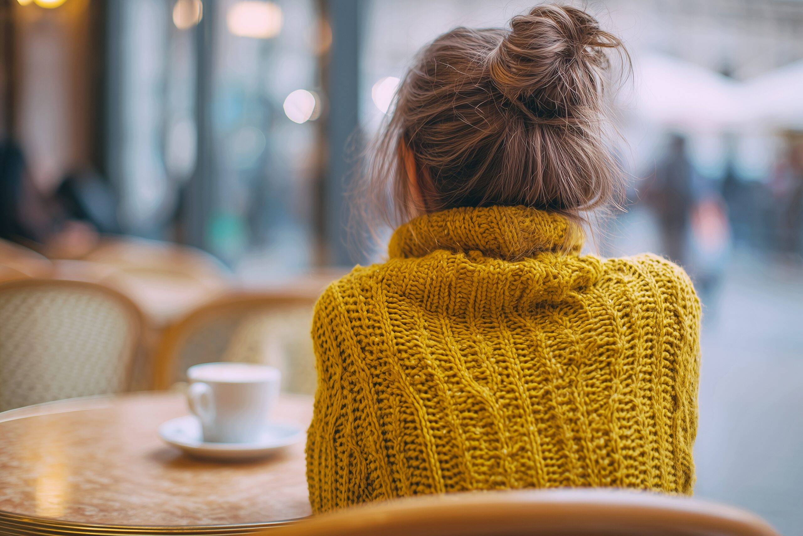 検索タグ:カフェ、cafe、飲食店、オシャレ、お洒落、おしゃれ、お店、店舗、フリー素材、フリー画像、AI生成画像、喫茶店、free image、インテリア、innteria、内装、内観、人物、後ろ姿、女性、女の人、女の子、女、主婦、後姿、コーヒーを飲む、休日、ニットを着た女性、秋服、冬服、お団子ヘア、まとめ髪