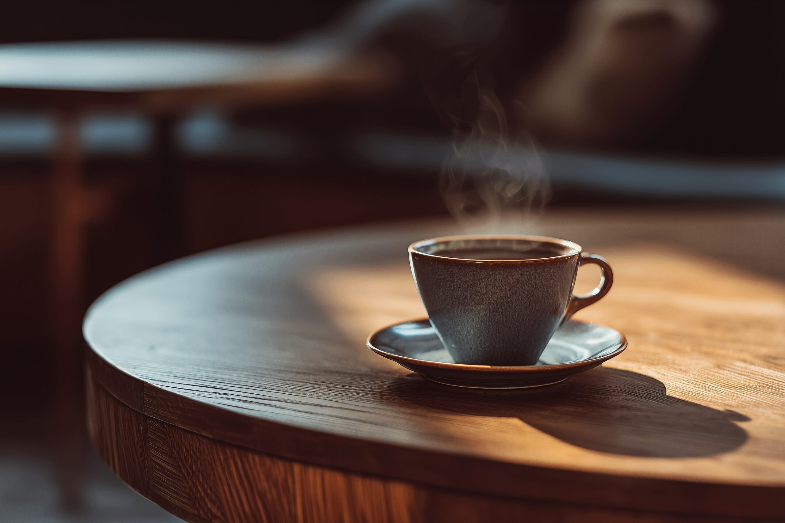 検索タグ:カフェ、インテリア、cafe、interior、店内、飲食店、オシャレ、お洒落、おしゃれ、木のテーブル、ホットコーヒー、フリー素材、フリー画像、AI生成画像、カフェラテ、モーニング、コピースペース、テキストスペース、ブラックコーヒー、背景、壁紙、珈琲、シンプル、アイキャッチ、フリー