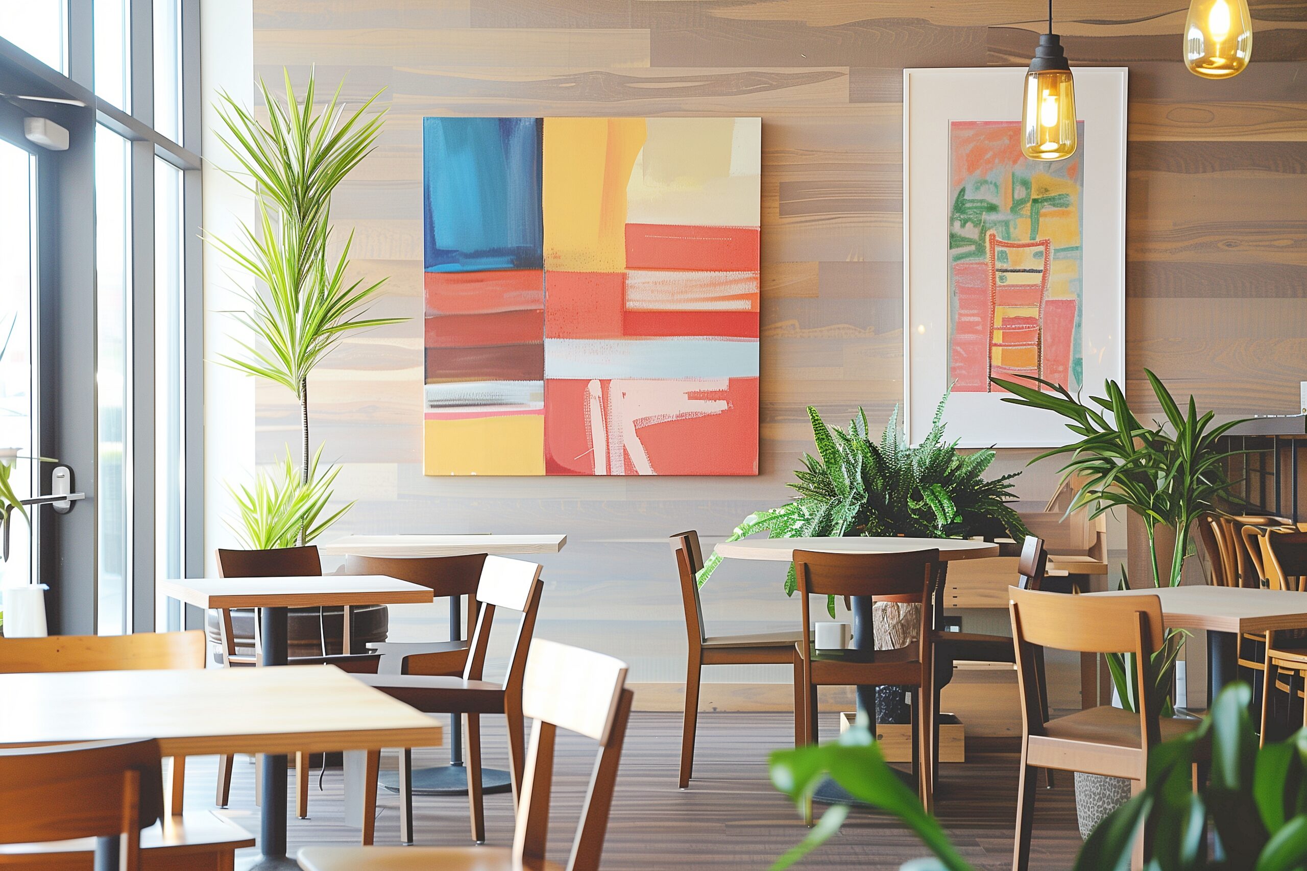 検索タグ:カフェ、インテリア、cafe、interior、店内、飲食店、オシャレ、お洒落、おしゃれ、室内、屋内、内装、内観、フリー素材、フリー画像、AI生成画像、シンプル、コピースペース、モダン、アート