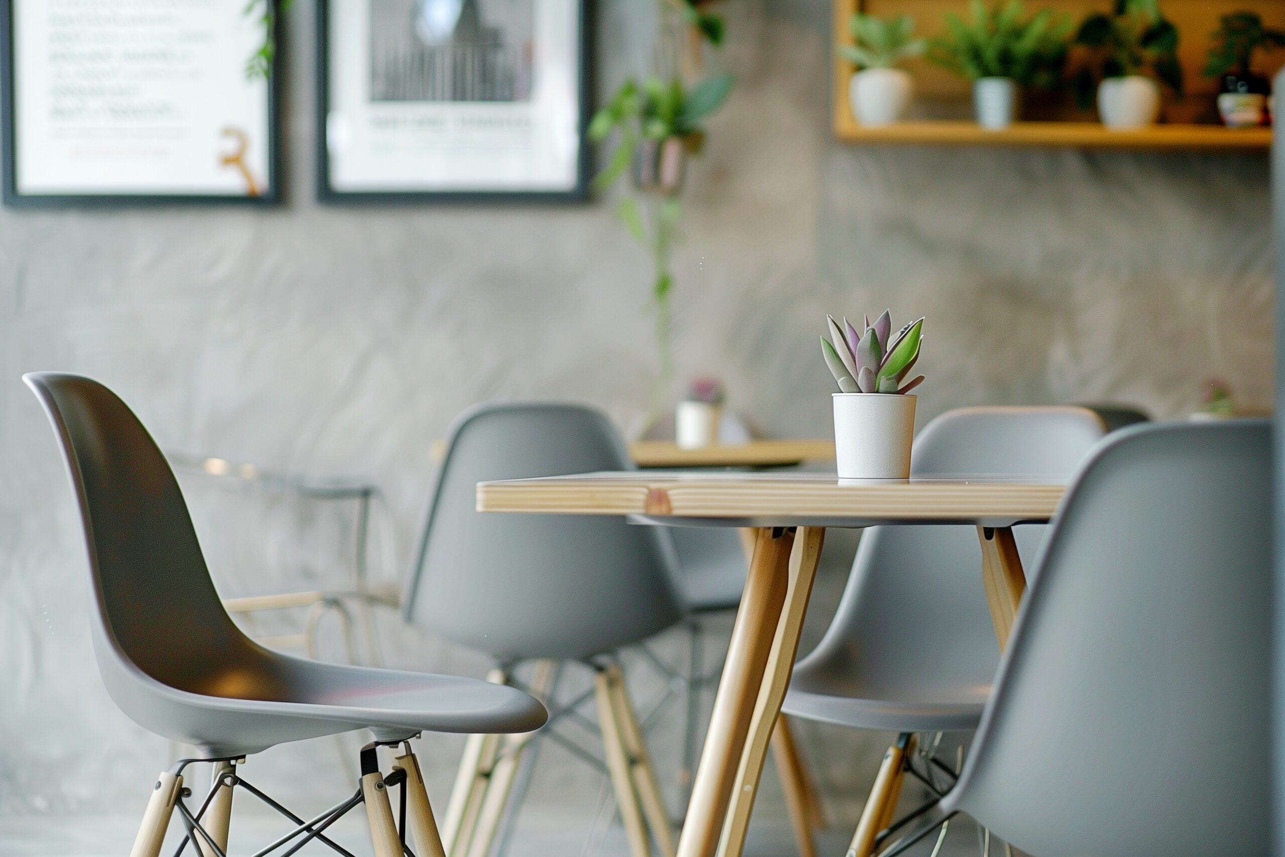 検索タグ:カフェ、インテリア、cafe、interior、店内、飲食店、オシャレ、お洒落、おしゃれ、室内、屋内、内装、内観、フリー素材、フリー画像、AI生成画像、テーブル、椅子、シンプル、コピースペース、モダン、グレー、灰色、シック、落ち着いた雰囲気