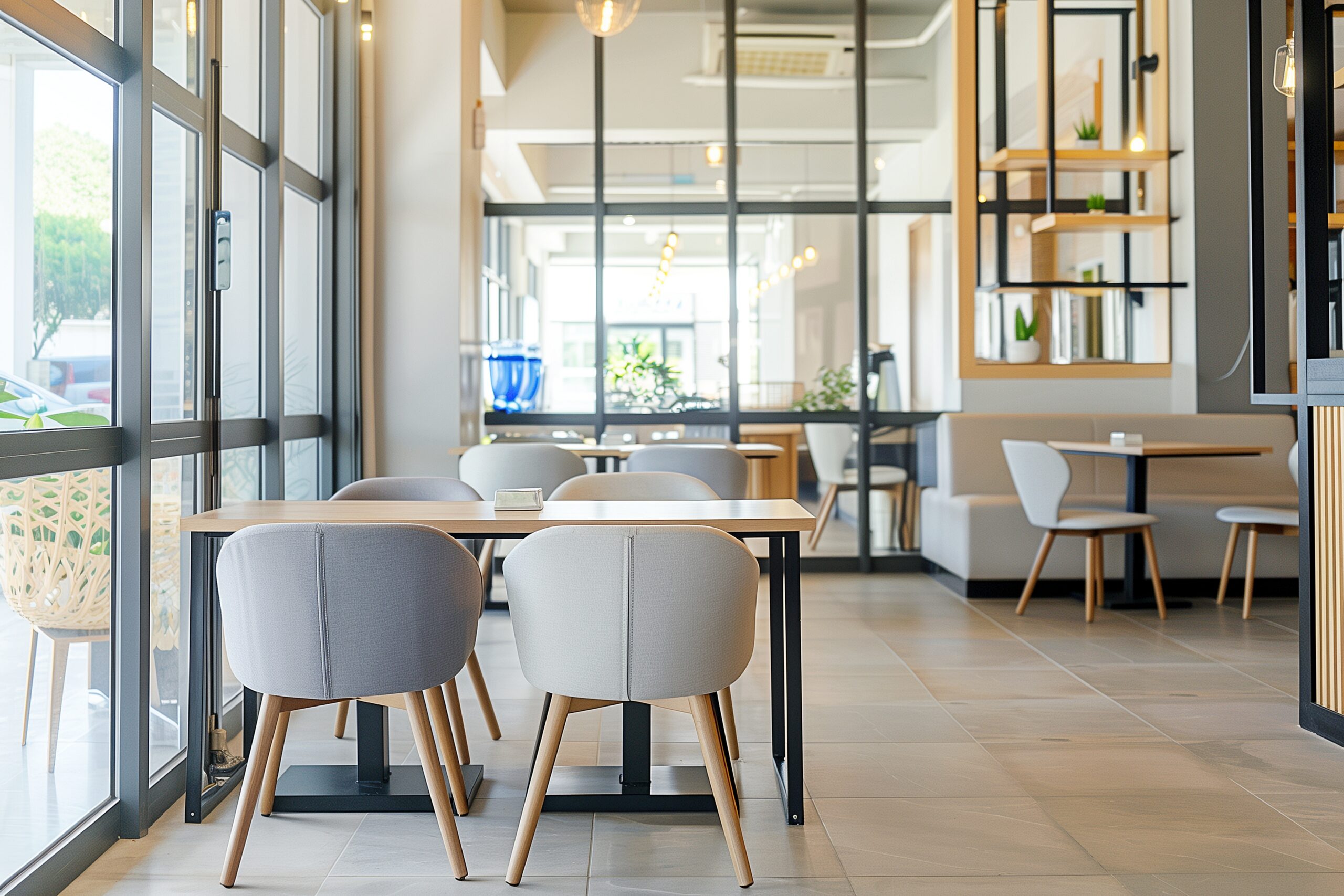検索タグ:カフェ、インテリア、cafe、interior、店内、飲食店、オシャレ、お洒落、おしゃれ、室内、屋内、内装、内観、フリー素材、フリー画像、AI生成画像、テーブル、椅子、シンプル、コピースペース、モダン、グレー、灰色、シック、落ち着いた雰囲気