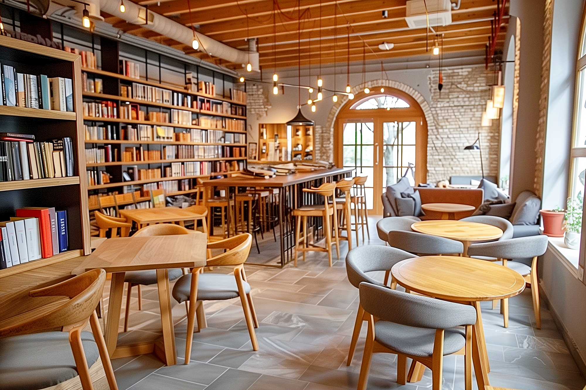 検索タグ:カフェ、インテリア、cafe、interior、店内、飲食店、オシャレ、お洒落、おしゃれ、ブックカフェ、本棚、フリー素材、フリー画像、AI生成画像、内装、内観、室内、店舗、お店、読書、図書館、Book、モダン、壁紙、ZOOM背景、配信用、背景素材、アイキャッチ、サムネイル、喫茶店