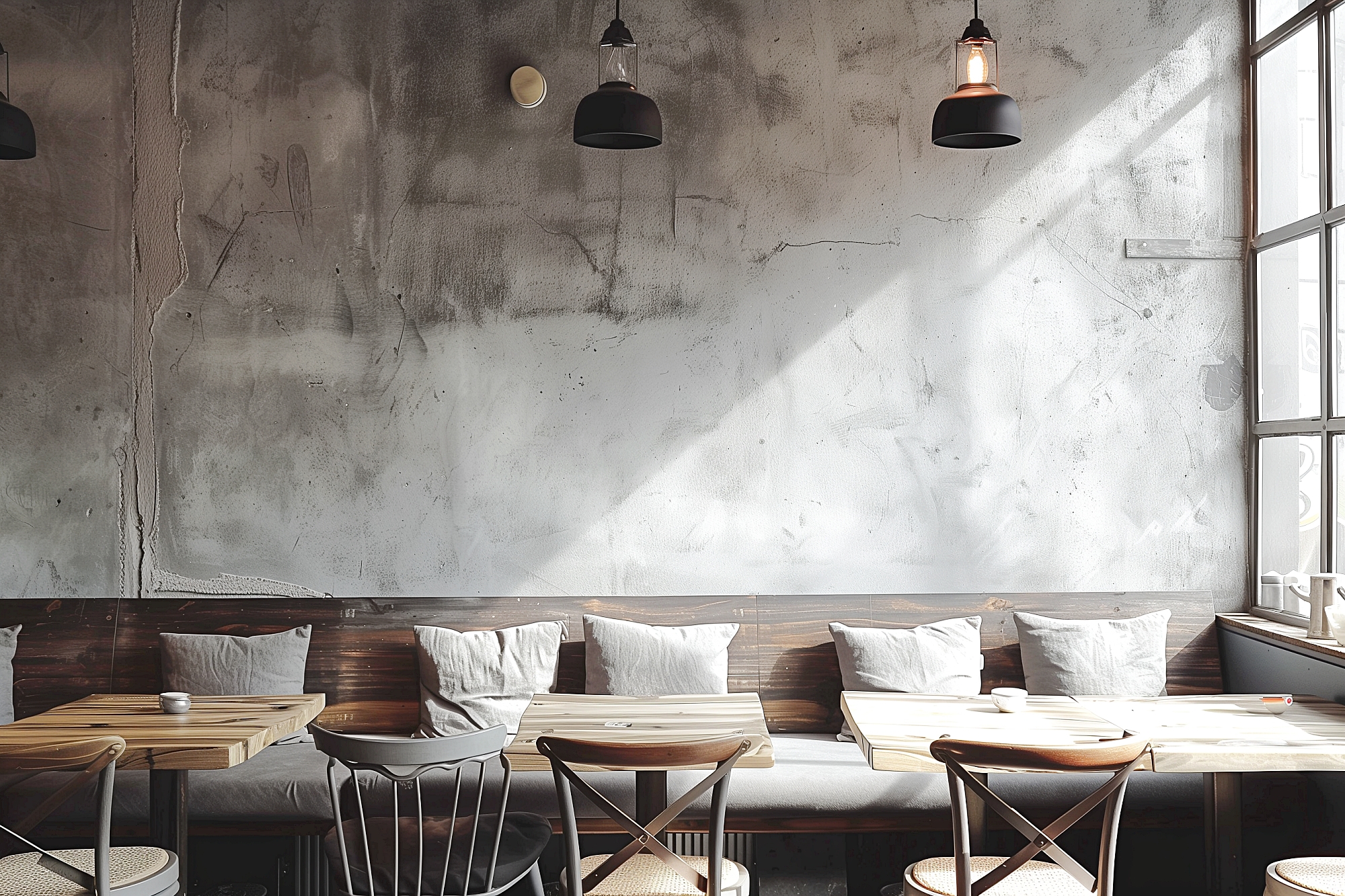 検索タグ:カフェ、インテリア、cafe、interior、店内、飲食店、オシャレ、お洒落、おしゃれ、フリー素材、フリー画像、AI生成画像、内装、内観、室内、店舗、お店、モダン、壁紙、ZOOM背景、配信用、背景素材、アイキャッチ、サムネイル、喫茶店、グレー、ソファ席、家具