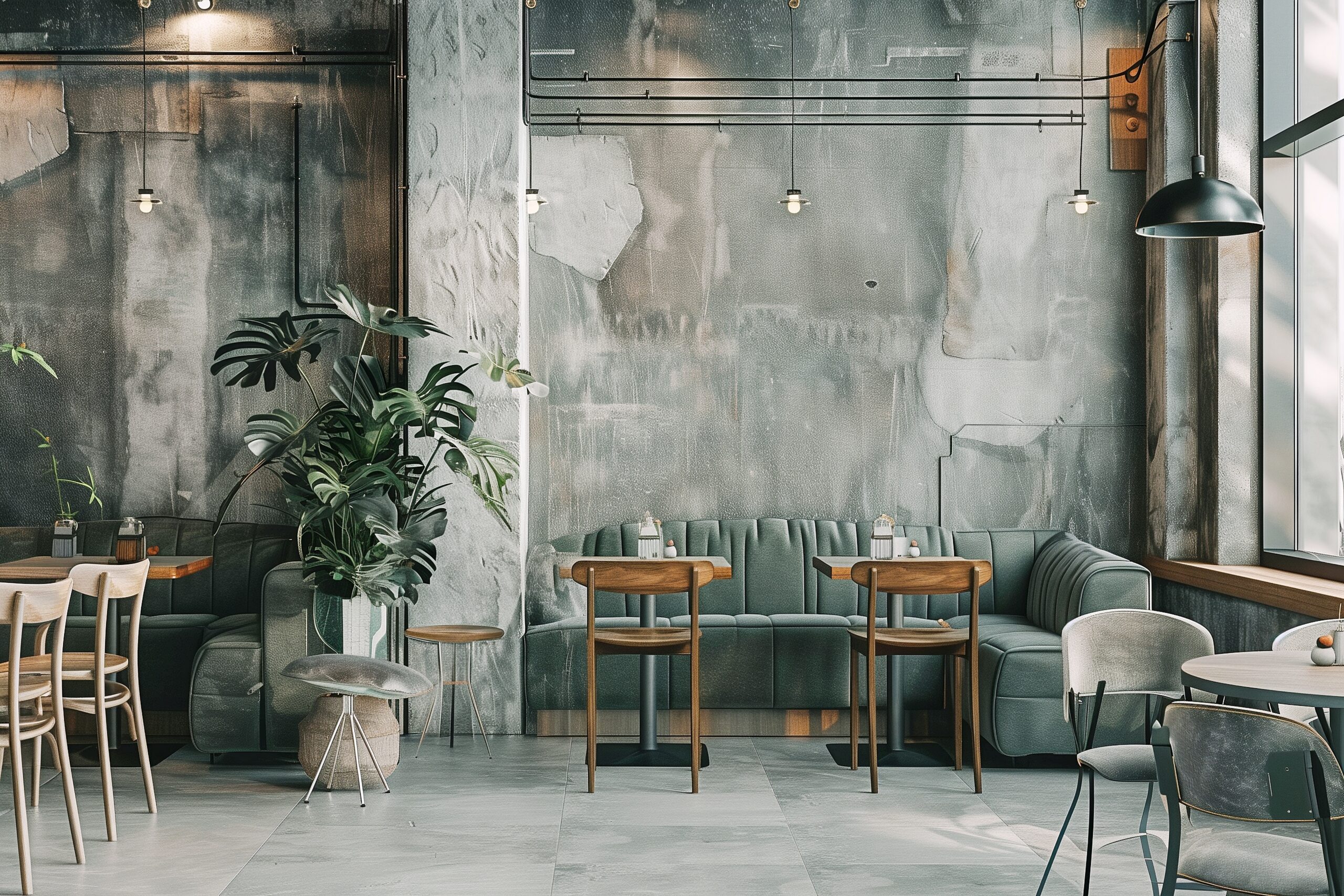 検索タグ:カフェ、インテリア、cafe、interior、店内、飲食店、オシャレ、お洒落、おしゃれ、グレー、ソファ席、コンクリート、室内、屋内、内装、内観、フリー素材、フリー画像、AI生成画像