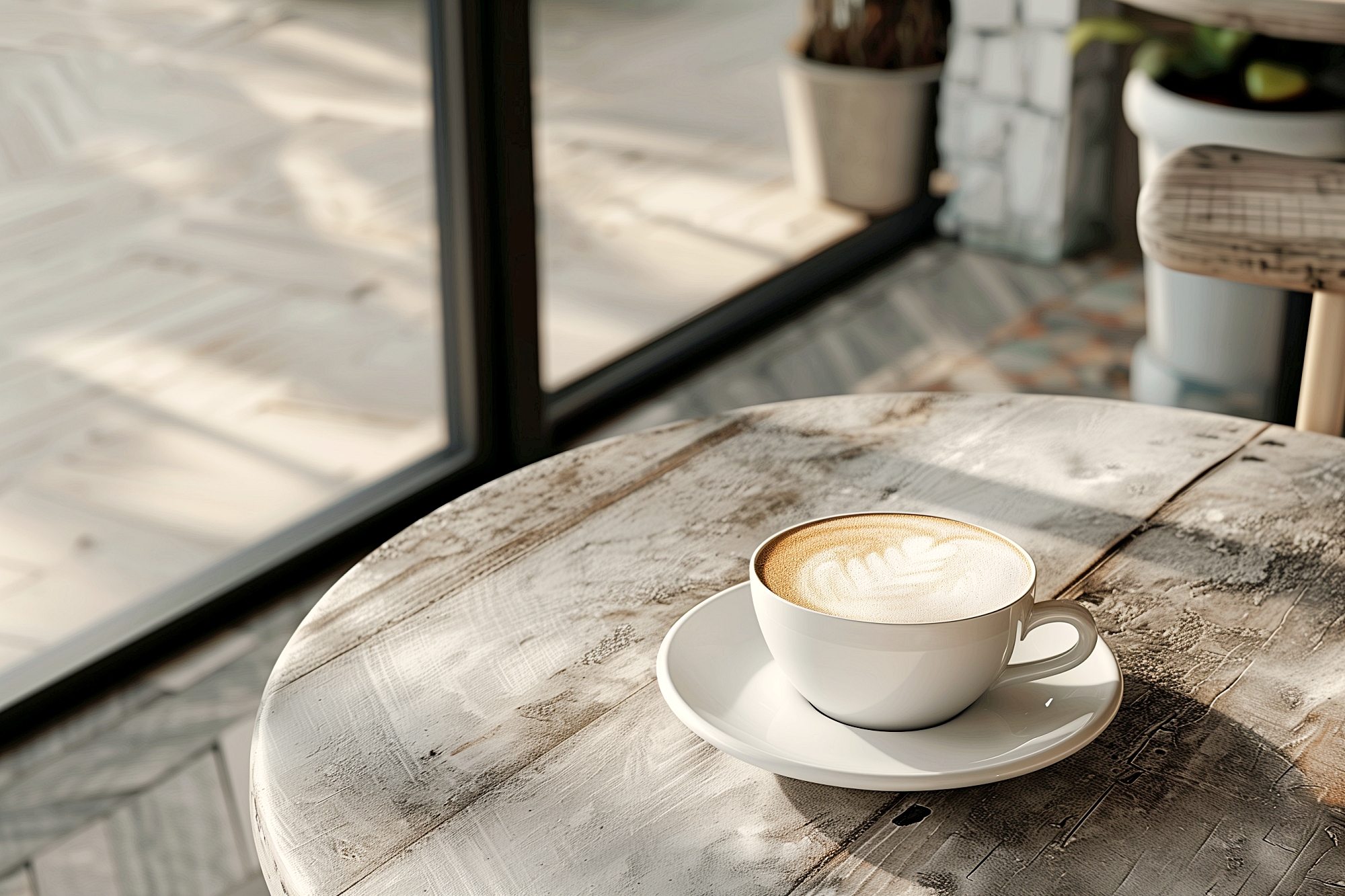 検索タグ:カフェ、インテリア、cafe、interior、店内、飲食店、オシャレ、お洒落、おしゃれ、木のテーブル、ホットコーヒー、フリー素材、フリー画像、AI生成画像、カフェラテ、モーニング、コピースペース、テキストスペース、背景、壁紙、珈琲、シンプル、カフェオレ、カプチーノ、泡、あわ、ラテアート