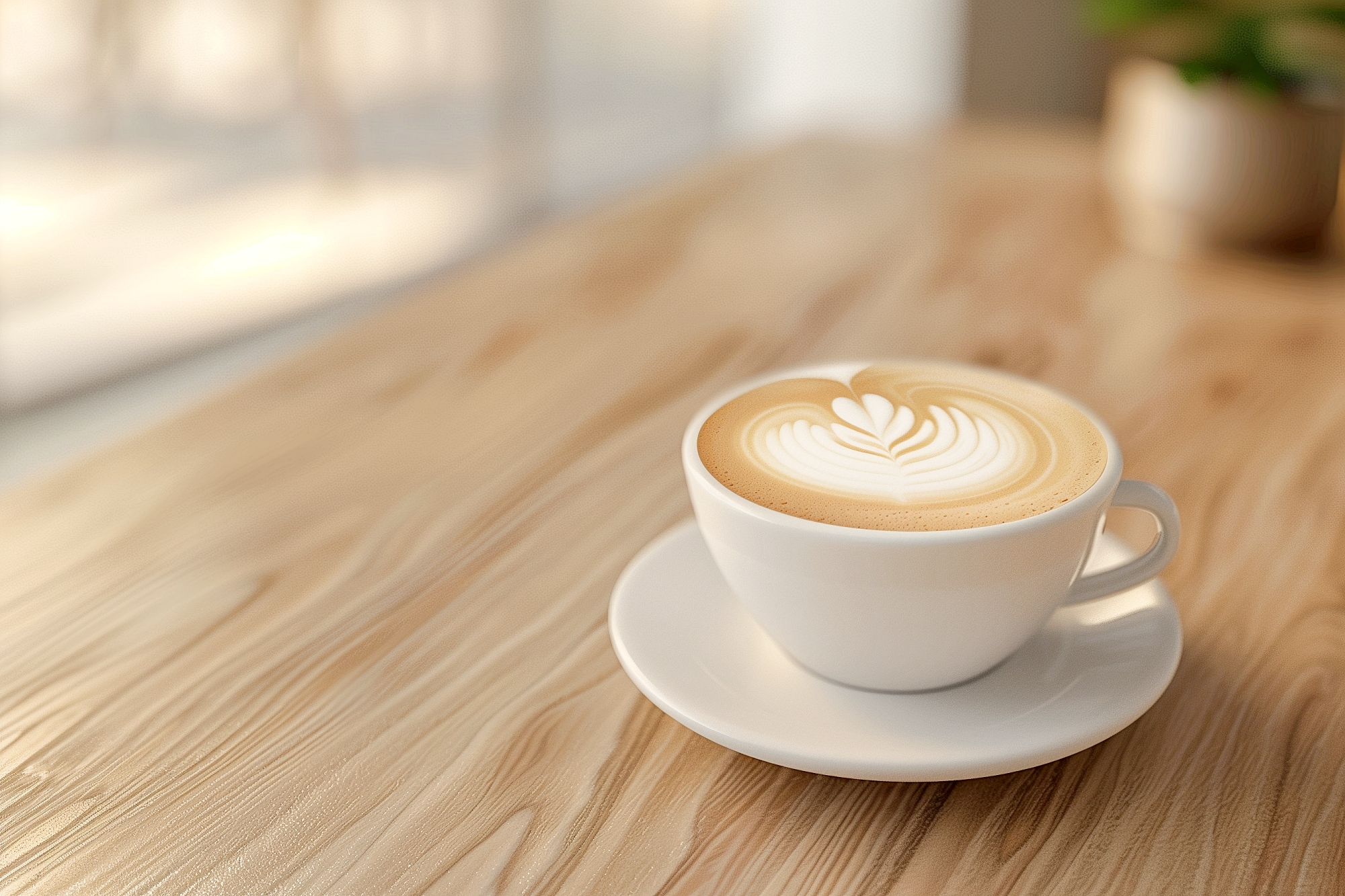 検索タグ:カフェ、インテリア、cafe、interior、店内、飲食店、オシャレ、お洒落、おしゃれ、木のテーブル、ホットコーヒー、フリー素材、フリー画像、AI生成画像、カフェラテ、モーニング、コピースペース、テキストスペース、背景、壁紙、珈琲、シンプル、カフェオレ、カプチーノ、泡、あわ、ラテアート