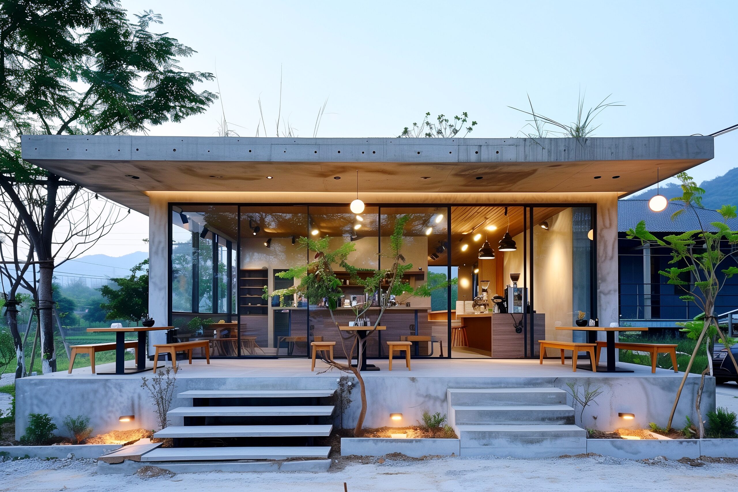 検索タグ:カフェ、cafe、飲食店、オシャレ、お洒落、おしゃれ、外観、建物、建築、グレー、コンクリート調、お店、店舗、大型、、フリー素材、フリー画像、AI生成画像