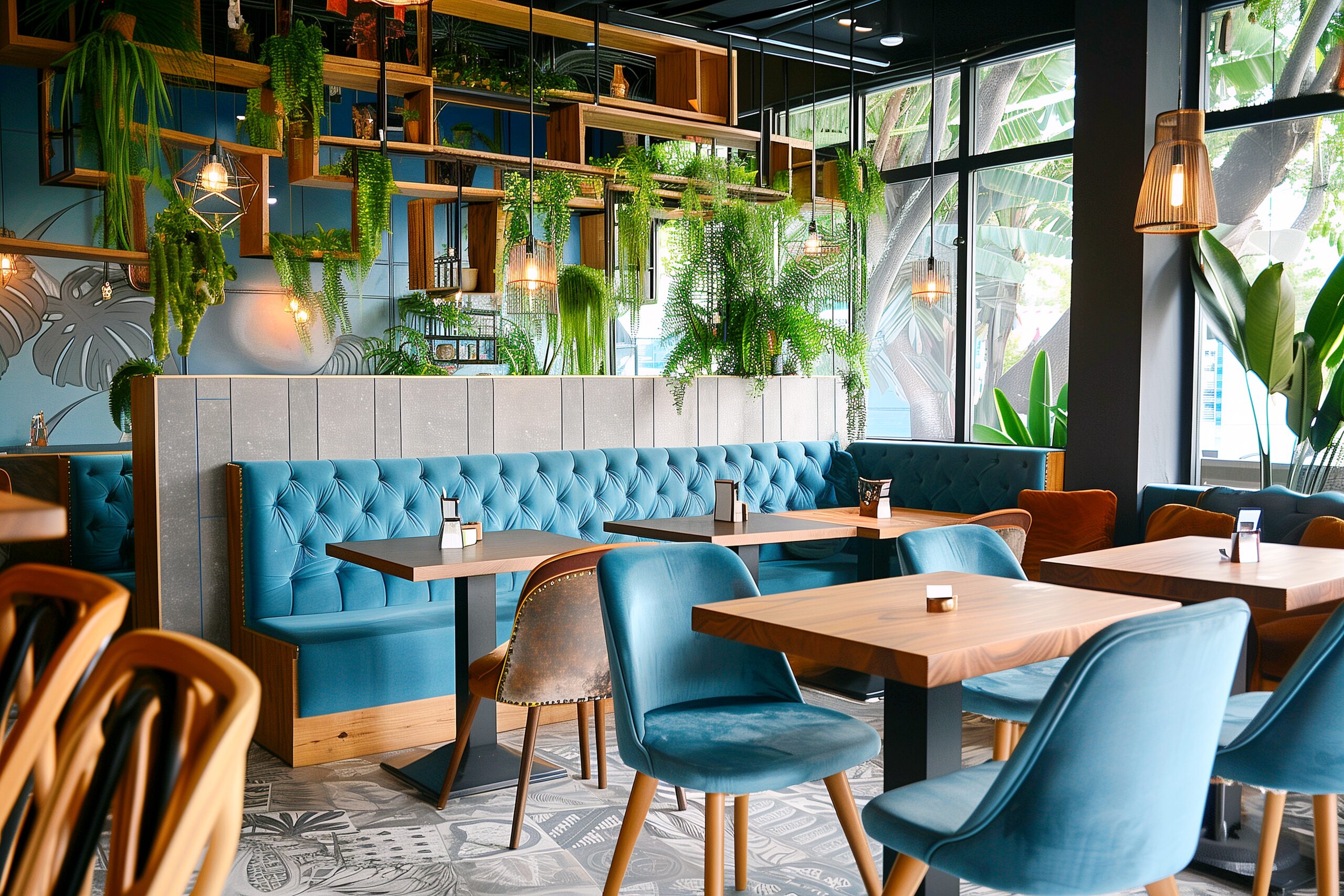 検索タグ:カフェ、インテリア、cafe、interior、店内、飲食店、オシャレ、お洒落、おしゃれ、明るい、ソファ席、テーブル、チェア、椅子、室内、屋内、内装、内観、フリー素材、フリー画像、ストックフォト、AI生成画像、青、ブルー