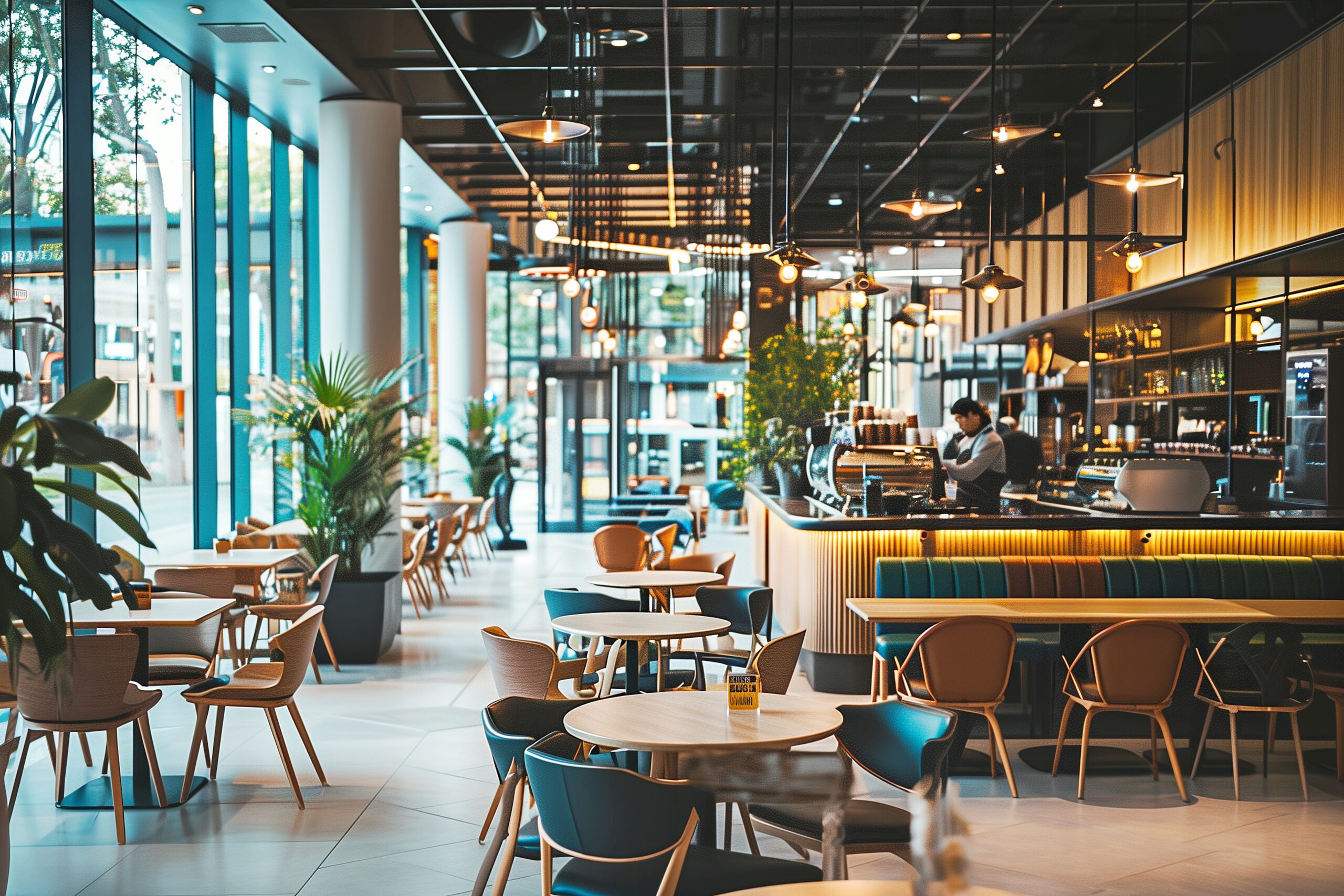 検索タグ:カフェ、インテリア、cafe、interior、店内、飲食店、オシャレ、お洒落、おしゃれ、室内、屋内、内装、内観、フリー素材、フリー画像、AI生成画像、木のテーブル、シンプル、コピースペース、広告、イメージ素材、カフェスペース、フードコート、ショッピングモール、机、椅子、イス