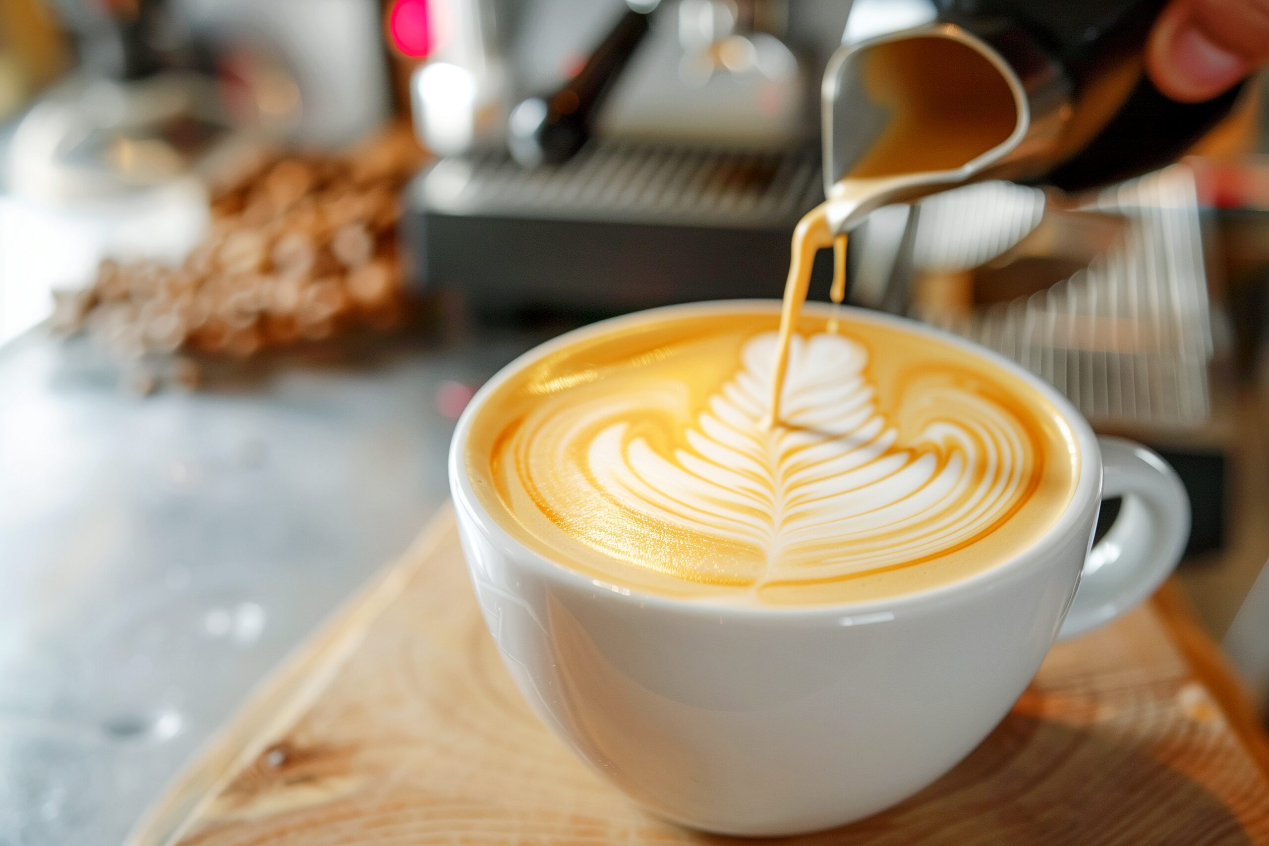 検索タグ:カフェ、インテリア、cafe、interior、店内、飲食店、オシャレ、お洒落、おしゃれ、木のテーブル、ホットコーヒー、ラテアート、フリー素材、フリー画像、AI生成画像、カフェラテ、モーニング、コピースペース、テキストスペース、無料画像、バリスタ