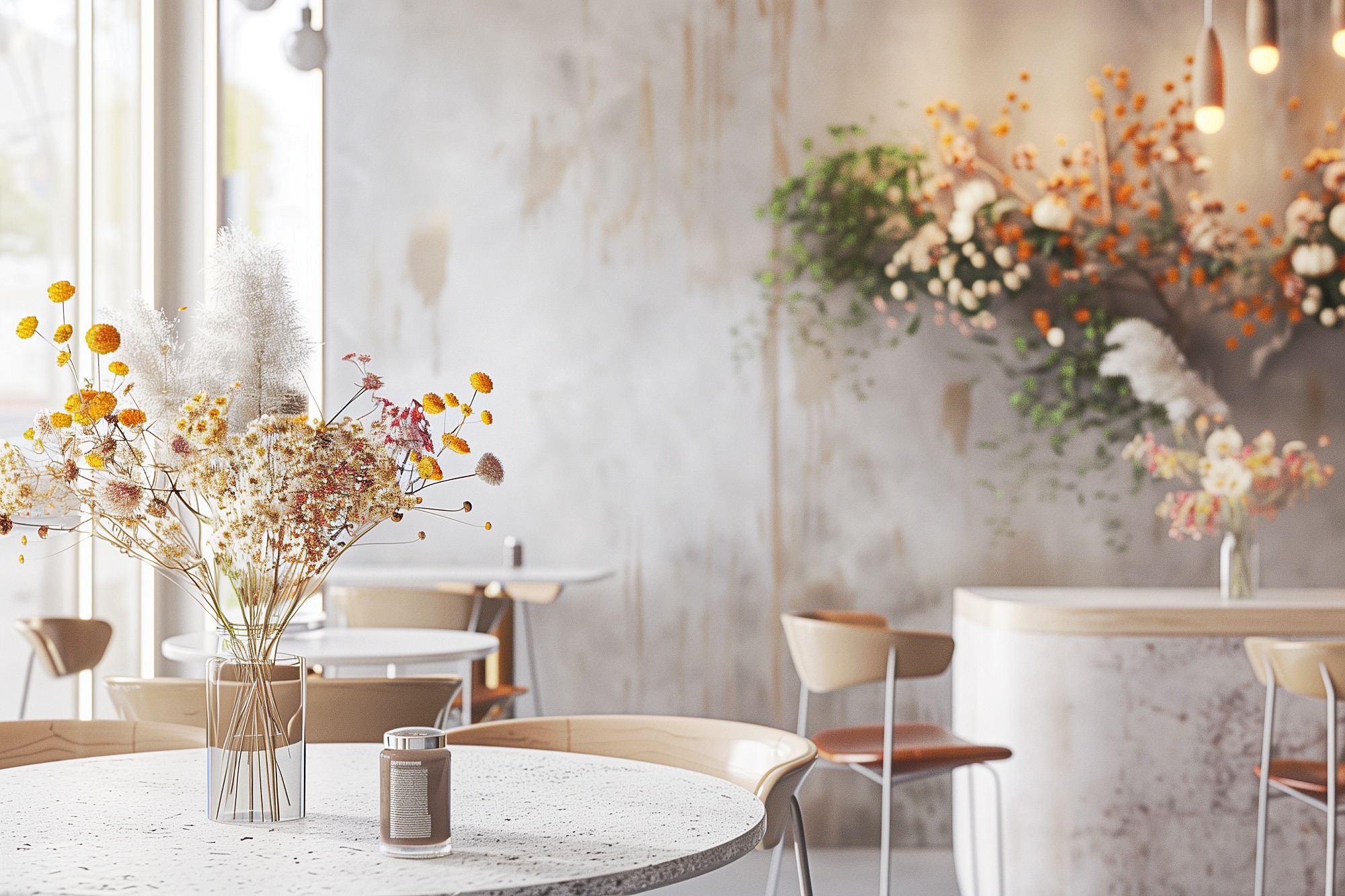 検索タグ:カフェ、インテリア、cafe、interior、店内、飲食店、オシャレ、お洒落、おしゃれ、フリー素材、フリー画像、AI生成画像、内装、内観、室内、店舗、お店、モダン、壁紙、ZOOM背景、配信用、背景素材、アイキャッチ、サムネイル、喫茶店、ドライフラワー、お花、花