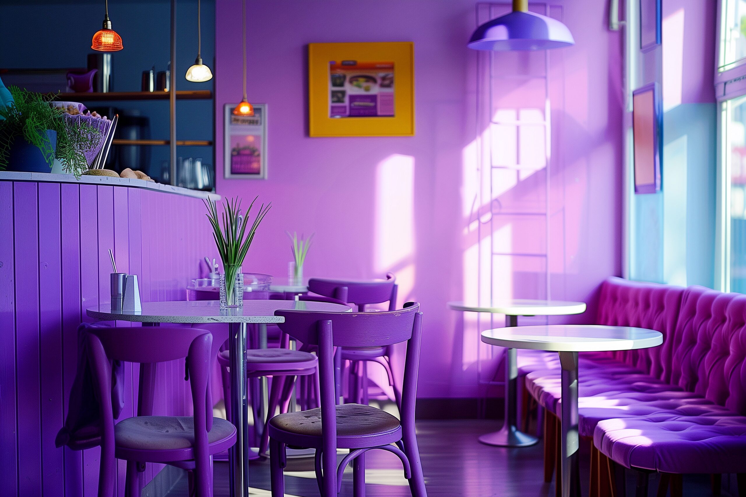 検索タグ:カフェ、インテリア、cafe、interior、店内、飲食店、オシャレ、お洒落、おしゃれ、室内、屋内、内装、内観、フリー素材、フリー画像、AI生成画像、木のテーブル、シンプル、コピースペース、パープル、purple、紫、紫色、レトロ感