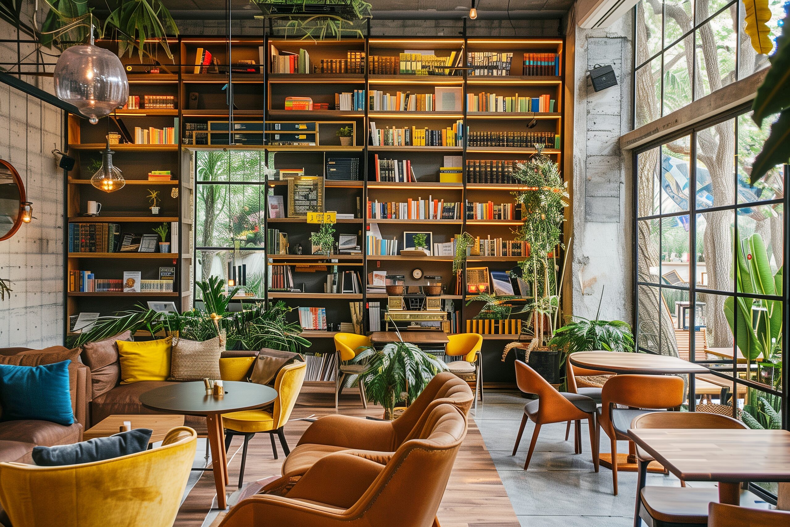 検索タグ:カフェ、インテリア、cafe、interior、店内、飲食店、オシャレ、お洒落、おしゃれ、ブックカフェ、本棚、フリー素材、フリー画像、AI生成画像、内装、内観、室内、店舗、お店、木のテーブル、洋書、読書、本、図書館、書店、店内