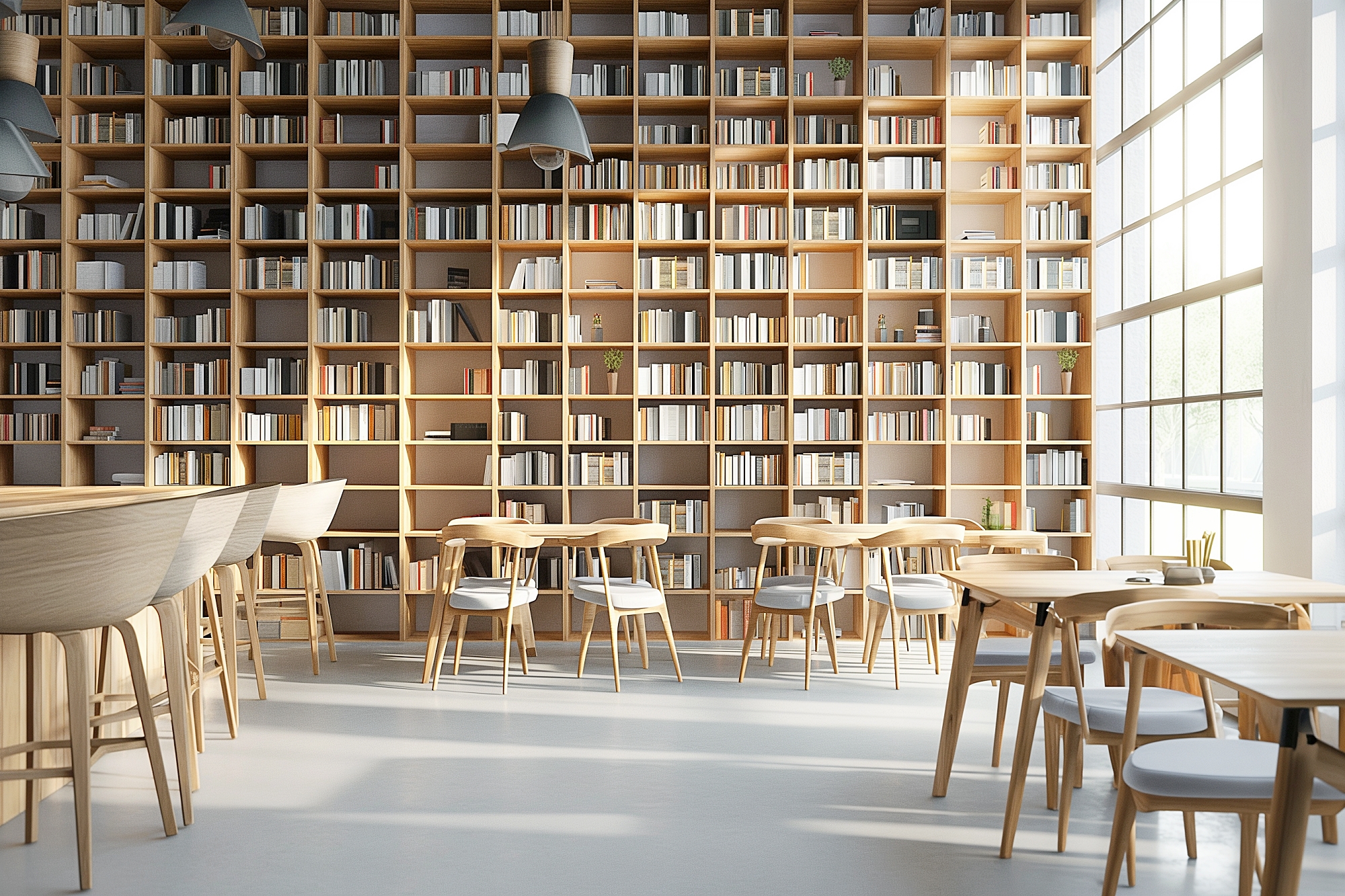 検索タグ:カフェ、インテリア、cafe、interior、店内、飲食店、オシャレ、お洒落、おしゃれ、ブックカフェ、本棚、フリー素材、フリー画像、AI生成画像、内装、内観、室内、店舗、お店、読書、図書館、Book、モダン、壁紙、ZOOM背景、配信用、背景素材、アイキャッチ、サムネイル、喫茶店