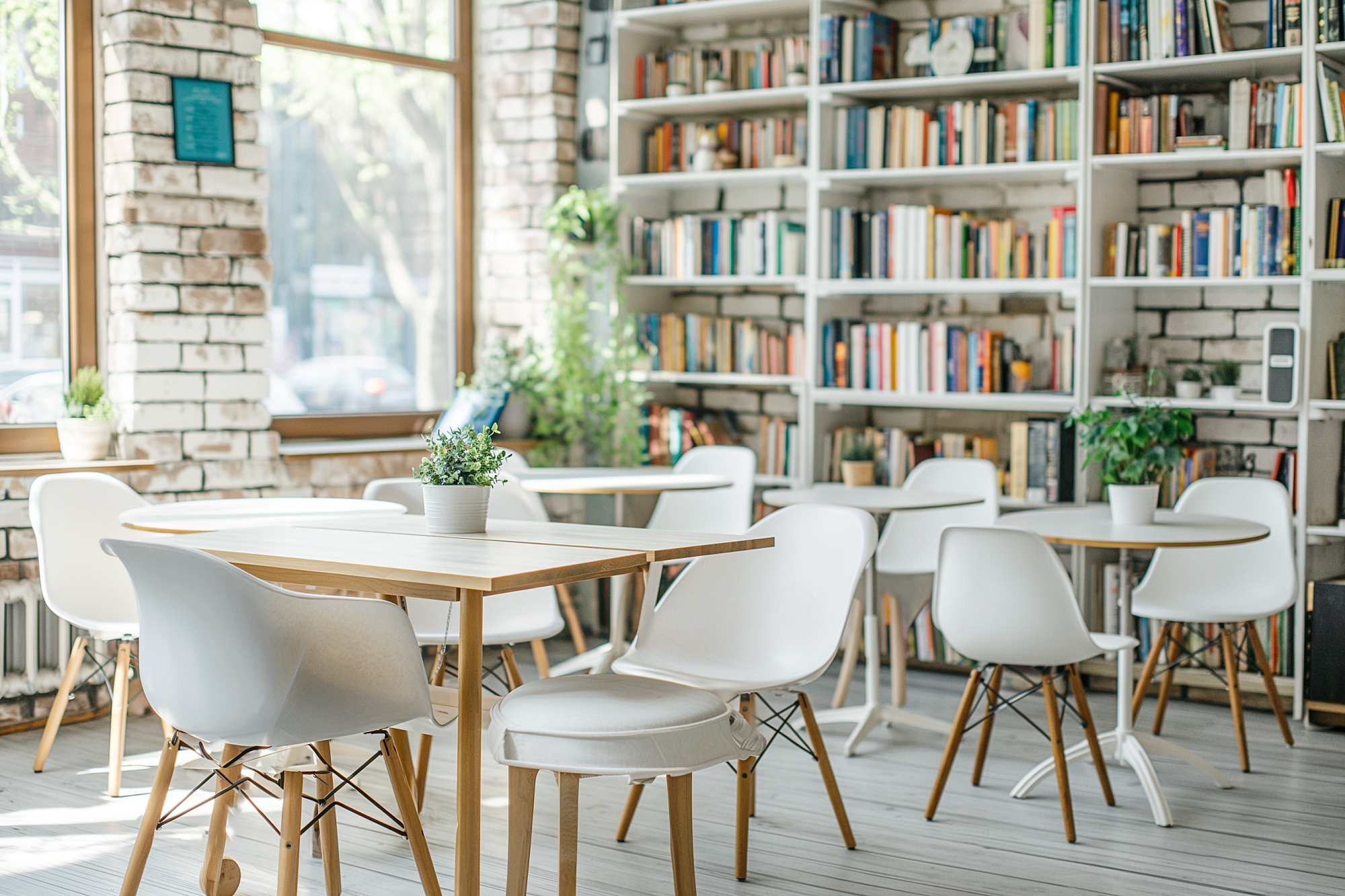 検索タグ:カフェ、インテリア、cafe、interior、店内、飲食店、オシャレ、お洒落、おしゃれ、ブックカフェ、本棚、フリー素材、フリー画像、AI生成画像、内装、内観、室内、店舗、お店、読書、図書館、Book、モダン、壁紙、ZOOM背景、配信用、背景素材、アイキャッチ、サムネイル、喫茶店