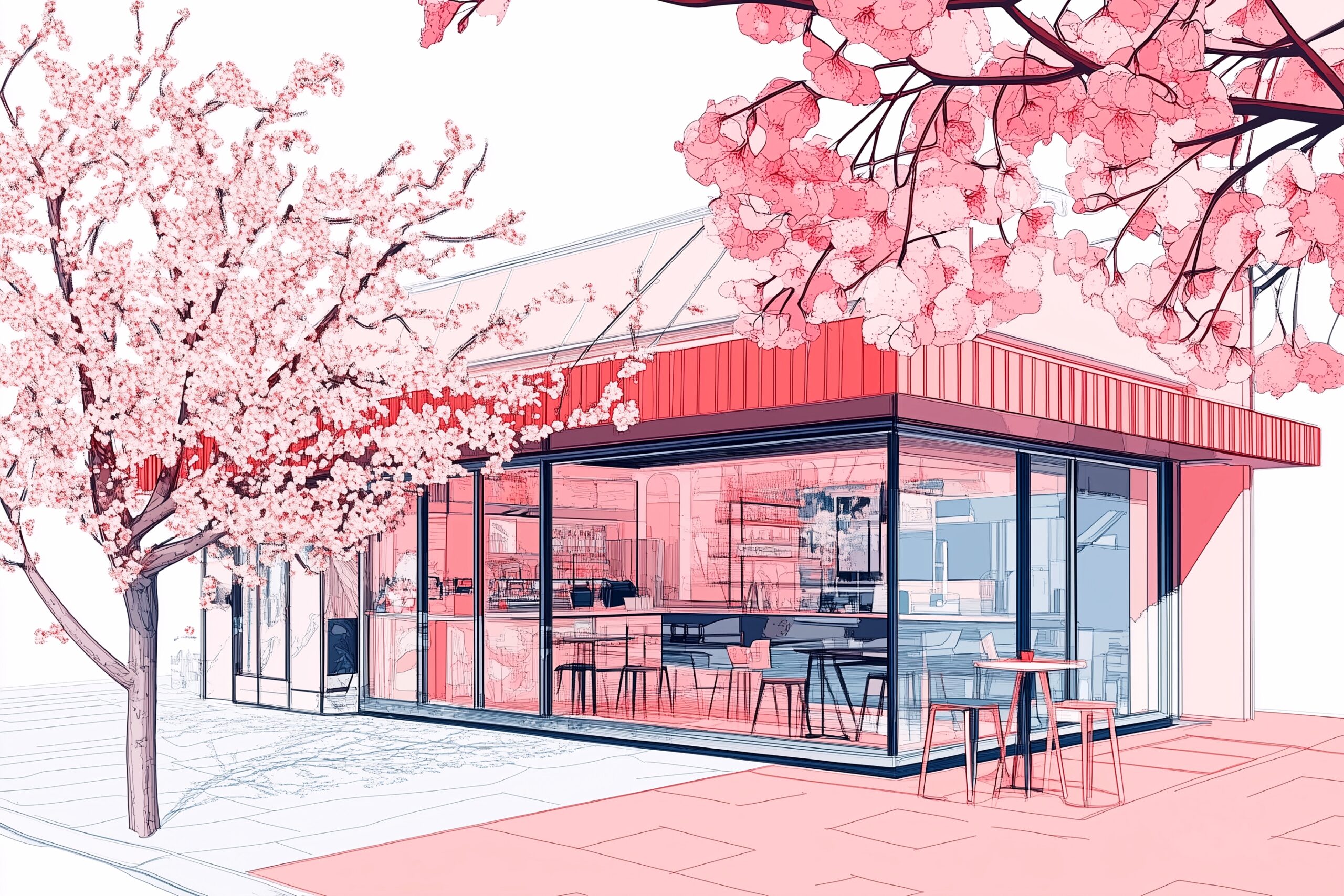 検索タグ:カフェ、cafe、飲食店、オシャレ、お洒落、おしゃれ、外観、建物、建築、お店、店舗、フリー素材、フリー画像、AI生成画像、モダン、飲食店、店、free、materials、image、shop、古民家、古い建物、レトロ、rétro、モダン、外装、桜、さくら、サクラ、春、Spring、SAKURA