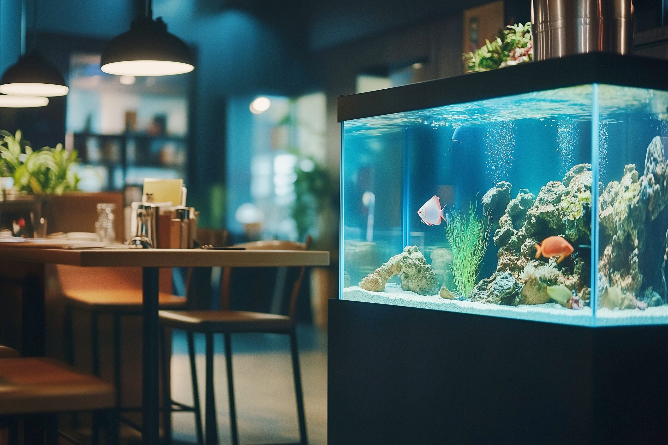検索タグ:カフェ、インテリア、cafe、interior、店内、飲食店、オシャレ、お洒落、おしゃれ、フリー素材、フリー画像、、free、image、materials、AI生成画像、内装、内観、室内、店舗、お店、モダン、壁紙、ZOOM背景、配信用、背景素材、アイキャッチ、サムネイル、喫茶店、レトロ、小洒落た、暗い、水槽、熱帯魚、魚、綺麗、きれい、キレイ、美しい、魚が泳ぐ、水族館