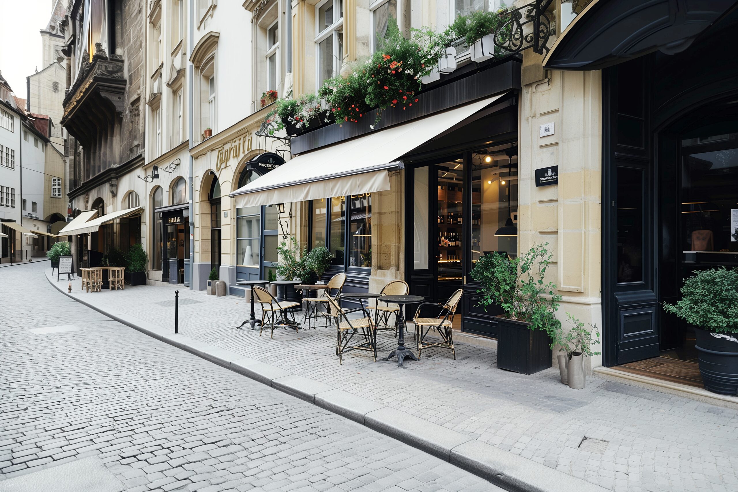 検索タグ:カフェ、cafe、飲食店、オシャレ、お洒落、おしゃれ、外観、建物、建築、お店、店舗、フリー素材、フリー画像、AI生成画像、レトロ感、海外、ヨーロッパ風、テラス席、小さなカフェ、デザイン、画像、外装、無料画像、前景、カフェショップフロント