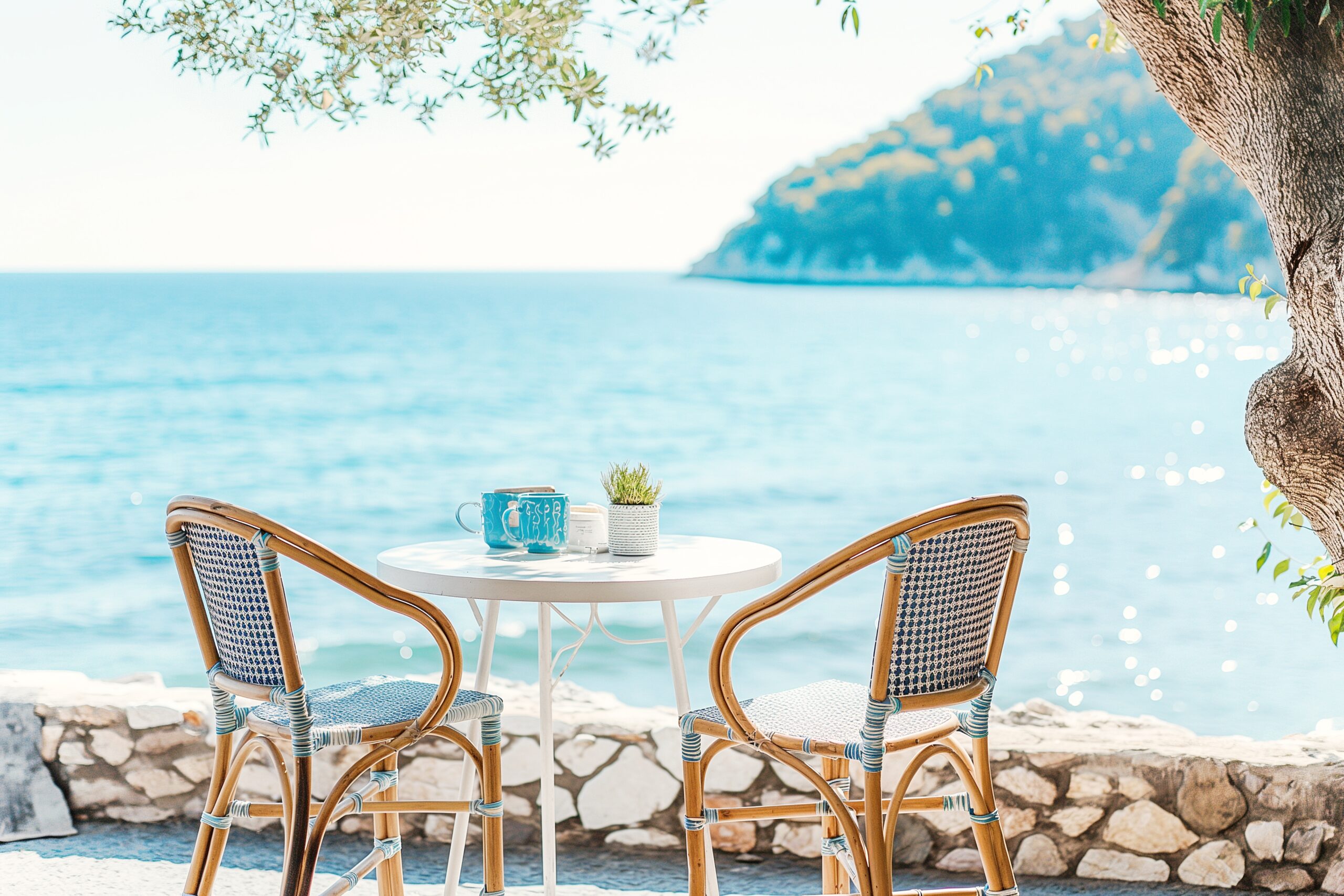 検索タグ:カフェ、cafe、飲食店、オシャレ、お洒落、おしゃれ、木のテーブル、フリー素材、フリー画像、AI生成画像、レストラン、カフェテラス、外、アウトドア、海辺、海沿い
