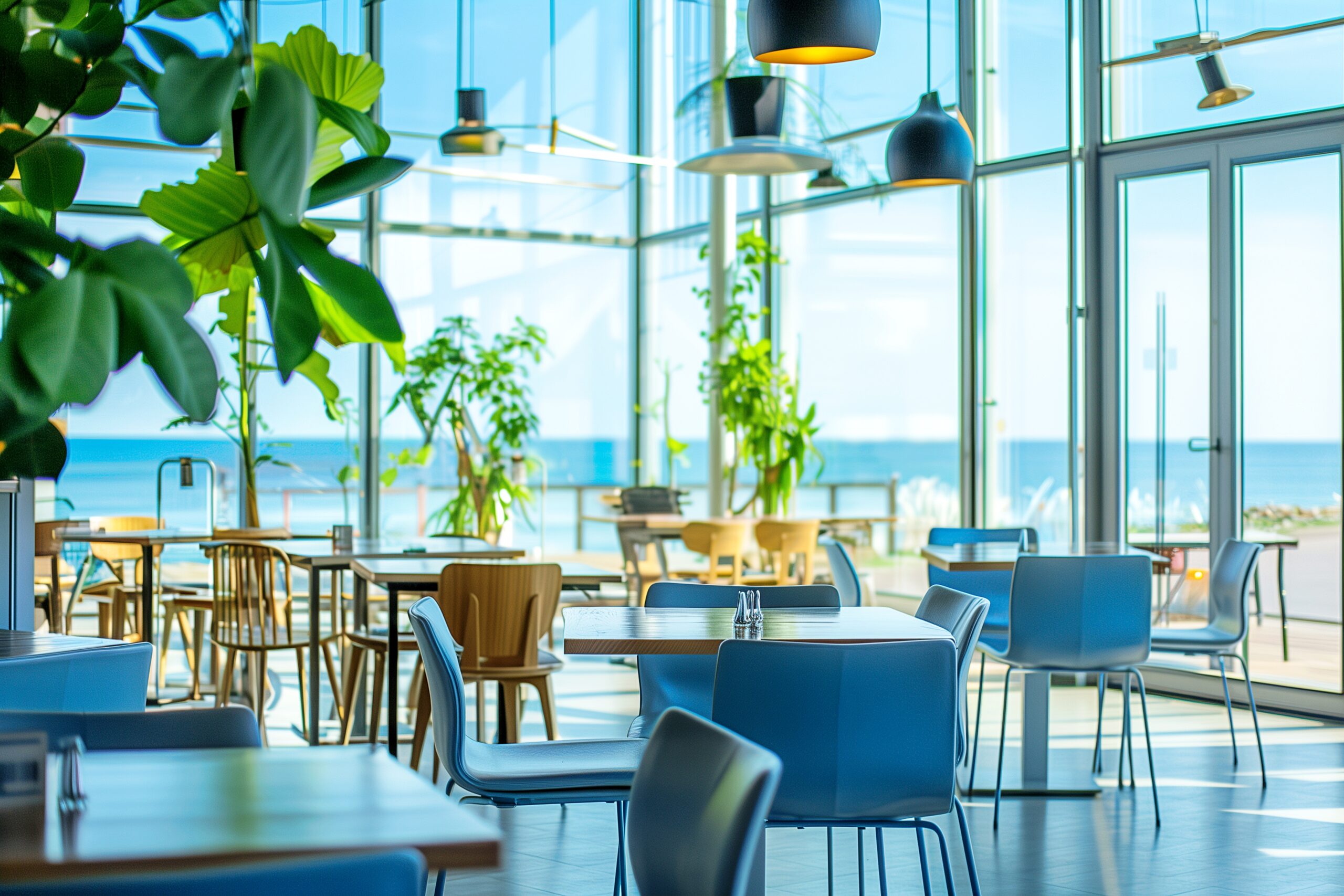 検索タグ:カフェ、インテリア、cafe、interior、店内、飲食店、オシャレ、お洒落、おしゃれ、室内、屋内、内装、内観、フリー素材、フリー画像、AI生成画像、海辺、海沿い、オーシャンビュー、海が見える、夏、リゾート地
