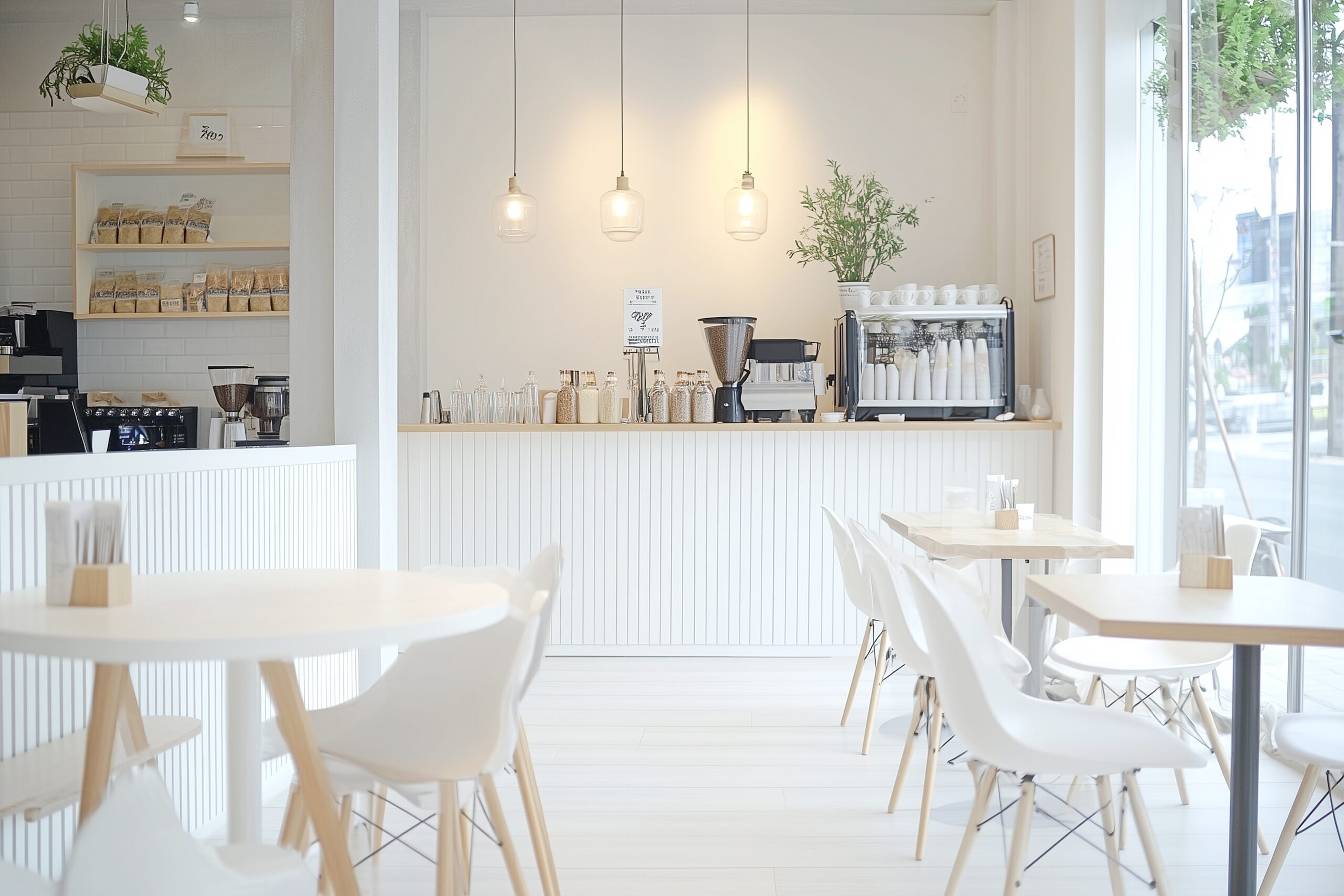 検索タグ:カフェ、インテリア、cafe、interior、店内、飲食店、オシャレ、お洒落、おしゃれ、フリー素材、フリー画像、AI生成画像、内装、内観、室内、店舗、お店、モダン、壁紙、ZOOM背景、配信用、背景素材、アイキャッチ、サムネイル、喫茶店、ナチュラル、素朴、テーブル、白、清潔感、ホワイト