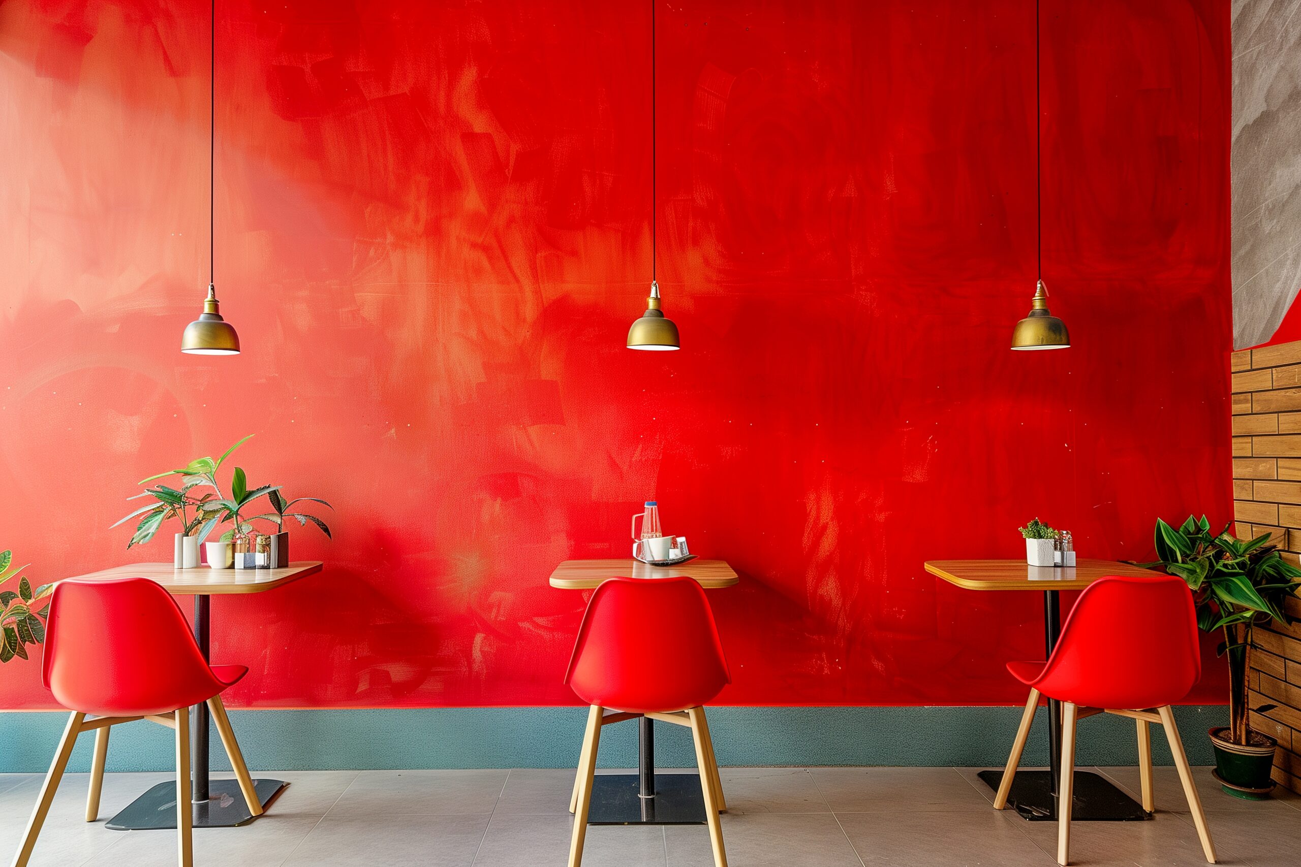 検索タグ:カフェ、インテリア、cafe、interior、店内、飲食店、オシャレ、お洒落、おしゃれ、室内、屋内、内装、内観、フリー素材、フリー画像、AI生成画像、木のテーブル、シンプル、コピースペース、赤、レッド、RED