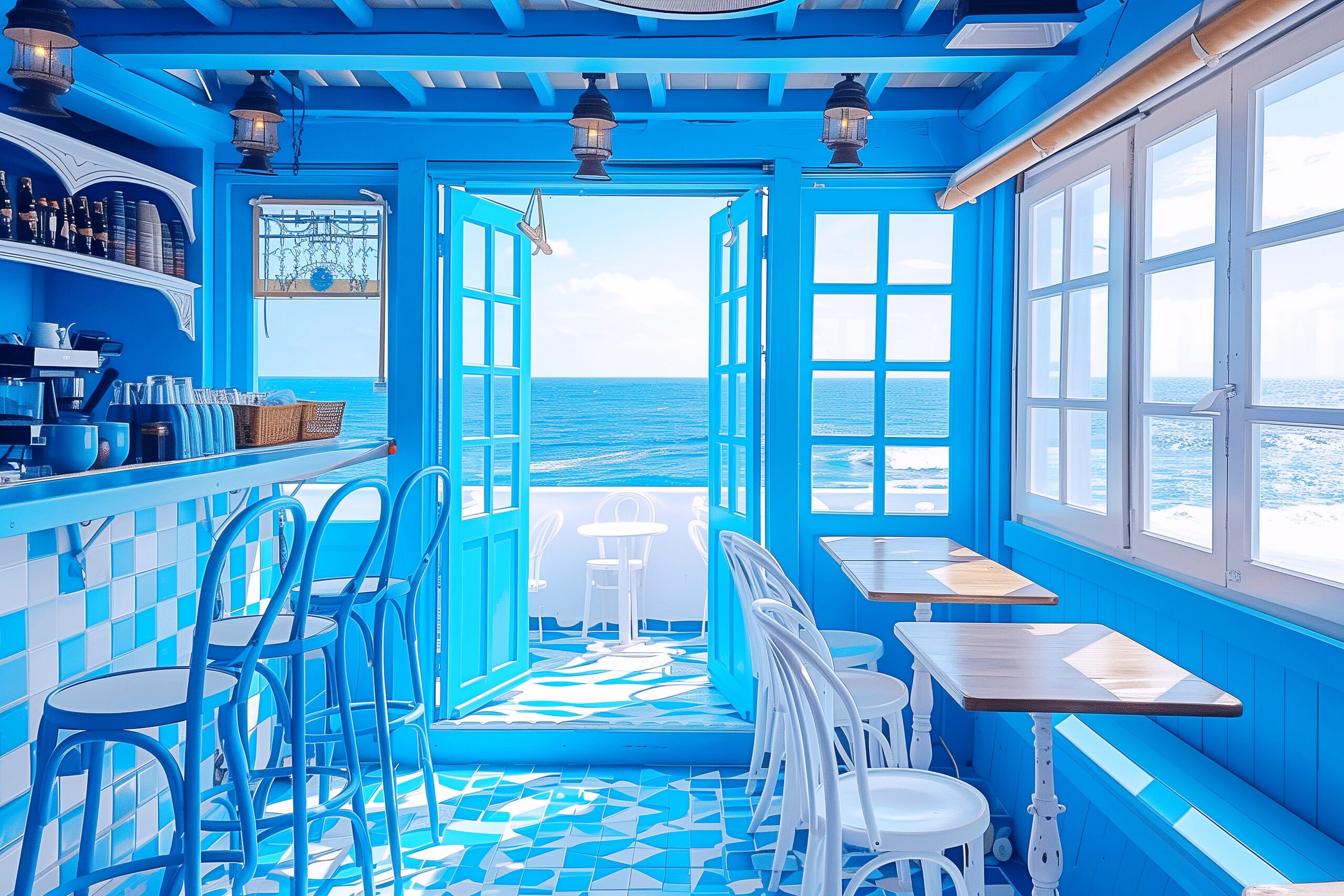 検索タグ:カフェ、インテリア、cafe、interior、店内、飲食店、オシャレ、お洒落、おしゃれ、室内、屋内、内装、内観、フリー素材、フリー画像、AI生成画像、海辺、海沿い、オーシャンビュー、海が見える、夏、リゾート地、海の家