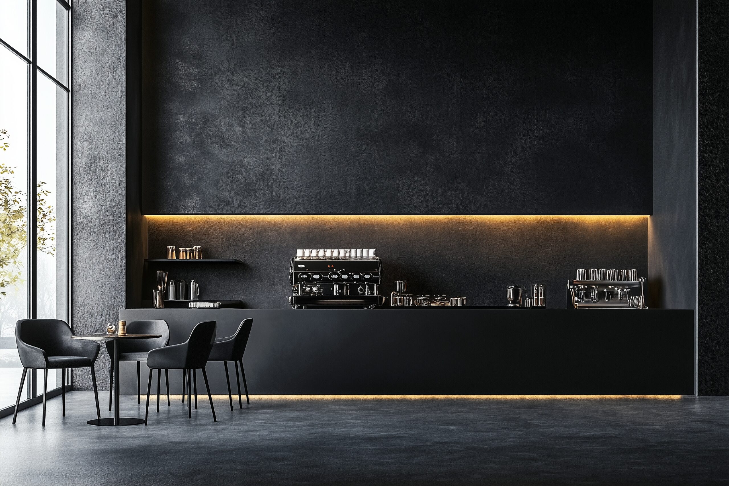 検索タグ:カフェ、インテリア、cafe、interior、店内、飲食店、オシャレ、お洒落、おしゃれ、フリー素材、フリー画像、、free、image、materials、AI生成画像、内装、内観、室内、店舗、お店、モダン、壁紙、ZOOM背景、配信用、背景素材、アイキャッチ、サムネイル、黒、ブラック、BLACK、ダーク、シンプル、モダン