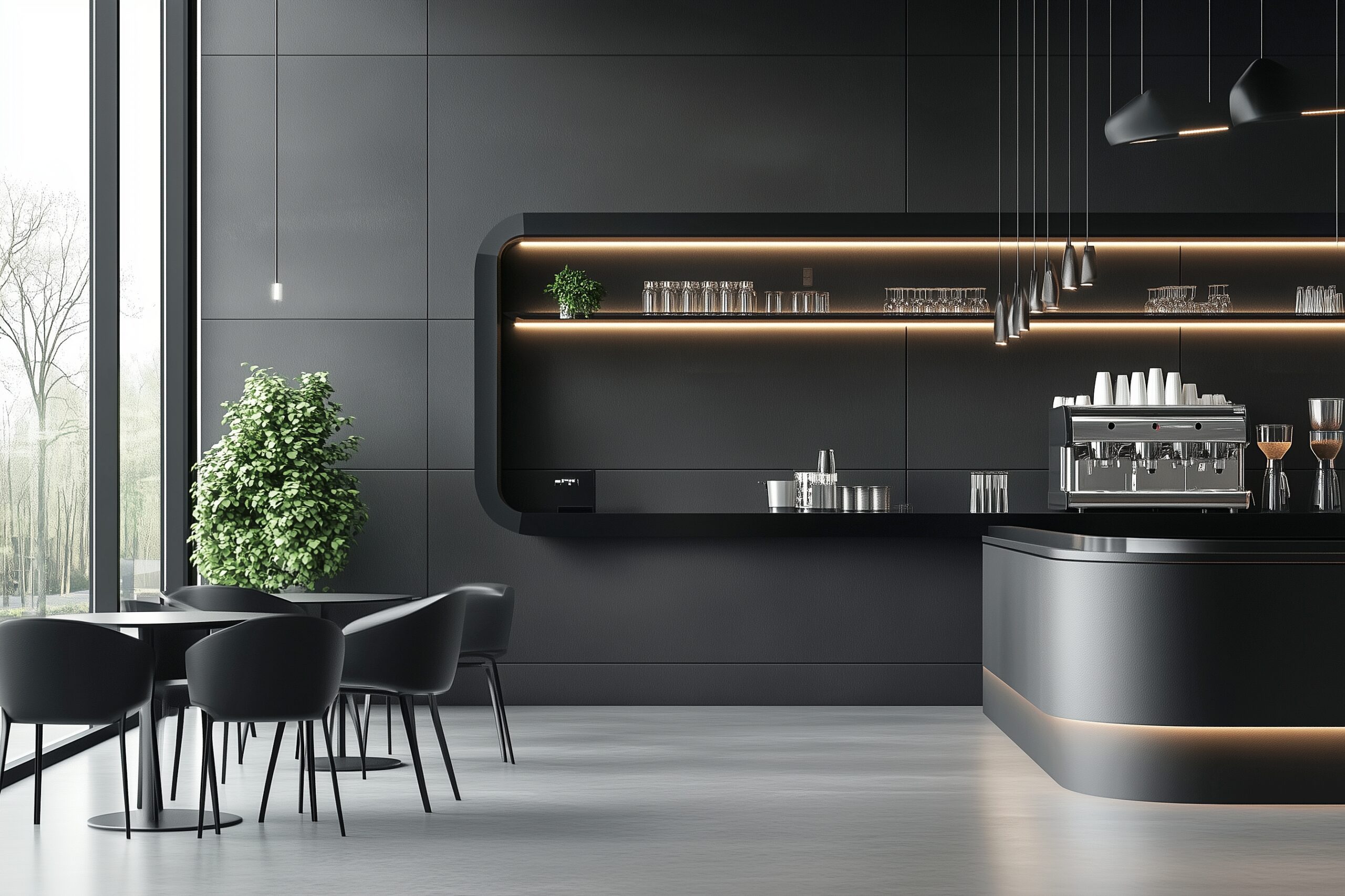 検索タグ:カフェ、インテリア、cafe、interior、店内、飲食店、オシャレ、お洒落、おしゃれ、フリー素材、フリー画像、、free、image、materials、AI生成画像、内装、内観、室内、店舗、お店、モダン、壁紙、ZOOM背景、配信用、背景素材、アイキャッチ、サムネイル、黒、ブラック、BLACK、ダーク、シンプル、モダン