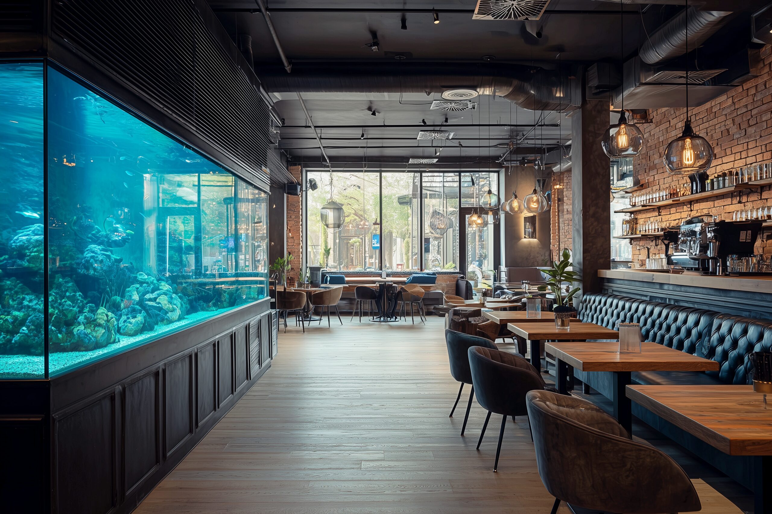 検索タグ:カフェ、cafe、飲食店、オシャレ、お洒落、おしゃれ、建物、建築、お店、店舗、フリー素材、フリー画像、AI生成画像、喫茶店、モダン、free image、インテリア、interior、内装、内観、背景素材、背景画像、Zoom背景、配信背景、水槽、大きな水槽、水族館、熱帯魚、綺麗、美しい、巨大水槽