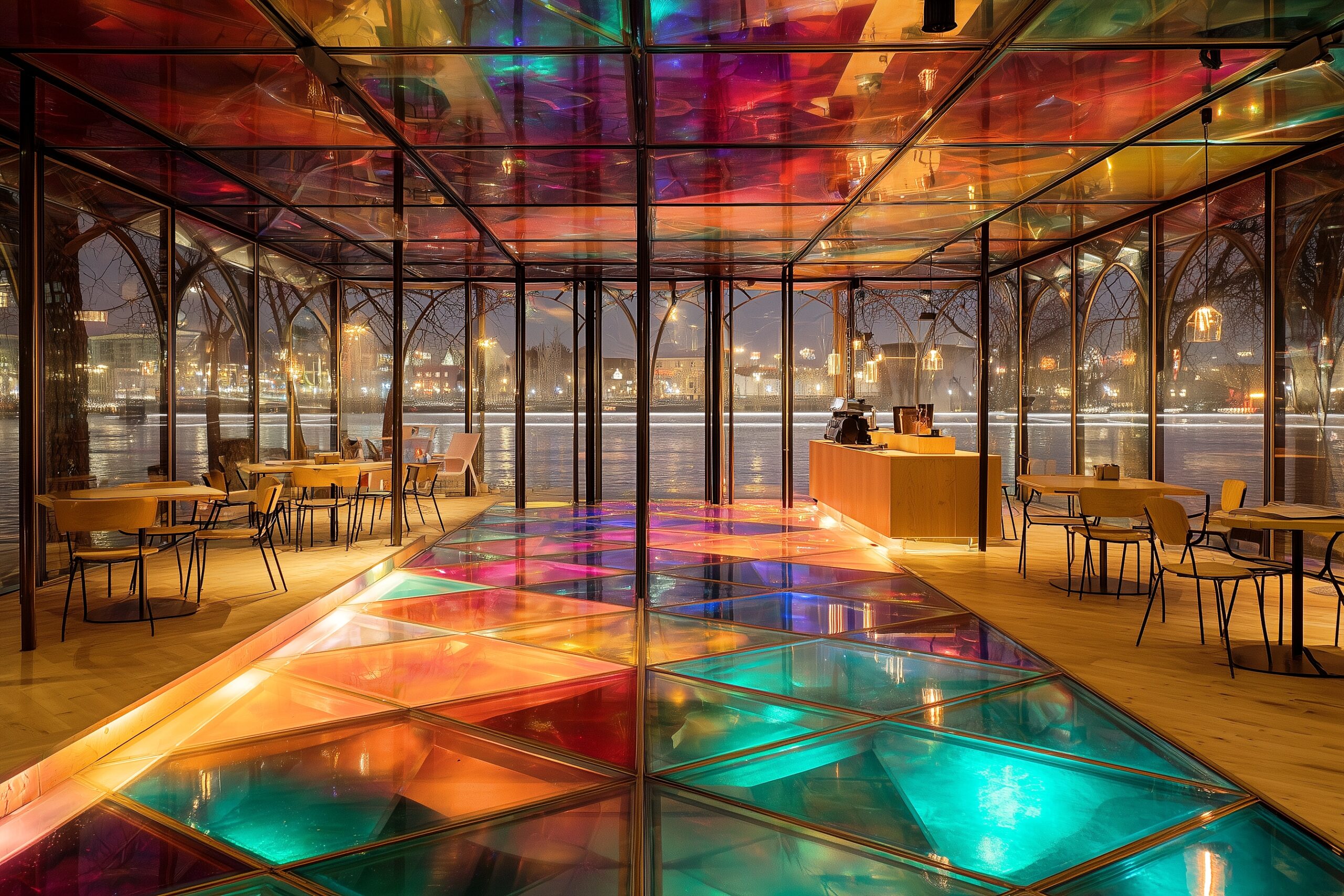 検索タグ:カフェ、インテリア、cafe、interior、店内、飲食店、オシャレ、お洒落、おしゃれ、フリー素材、フリー画像、AI生成画像、コピースペース、テキストスペース、無料画像、カフェテーブル、カフェタイム、table、テーブル席、インテリア、室内、内装、内観、高級、ゴージャス、エレガント、高級感、品のある、ガラス張り、カラフル、レインボー、虹色