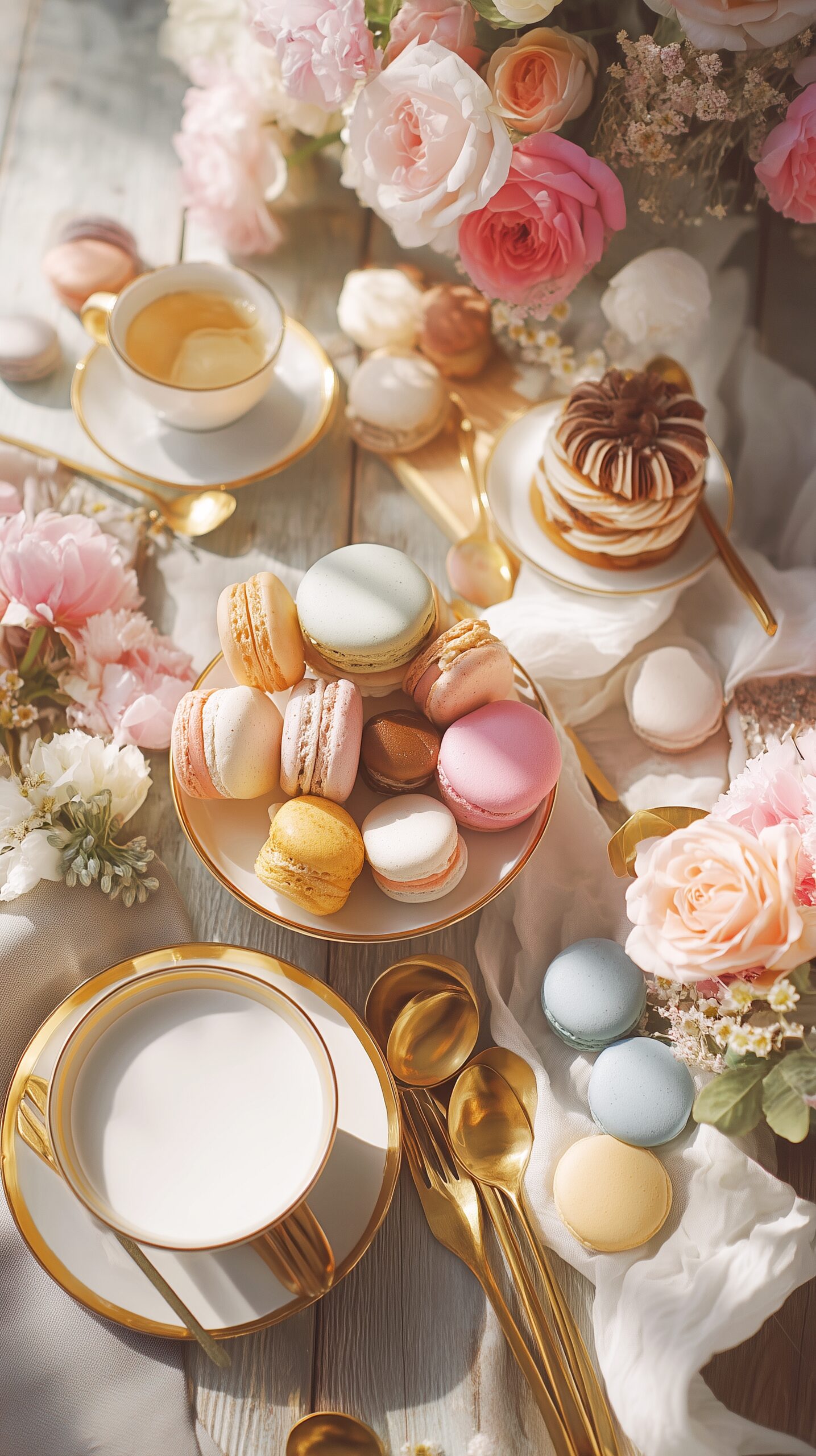 【スマホ壁紙】カフェテーブルに置かれたおしゃれなマカロンとスイーツ・フリー素材03