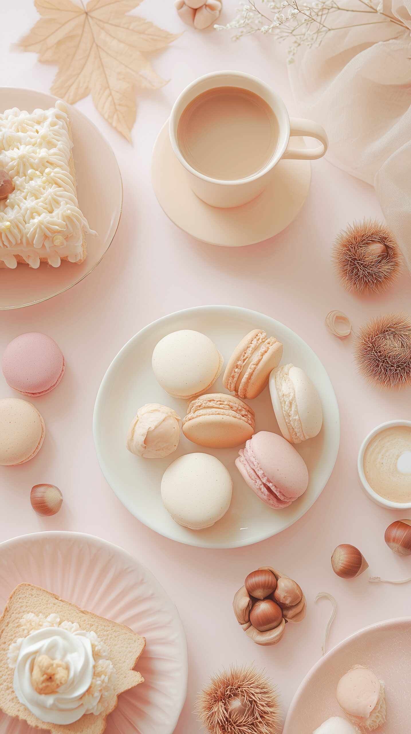検索タグ:カフェ、インテリア、cafe、interior、店内、飲食店、オシャレ、お洒落、おしゃれ、フリー素材、フリー画像、AI生成画像、コピースペース、テキストスペース、無料画像、カフェテーブル、カフェタイム、縦長、壁紙、ロック画面、スマホ、スマホ壁紙、ショート動画用、縦動画用、iPhone、アイフォン、アイホン、table、テーブル席、喫茶店、スイーツ、食べ物、デザート、アフタヌーンティー、ケーキ、食事、食後、ホットコーヒー、latte art、ラテアート、マカロン、macaron、パステルカラー、Pastel color、栗、くり、マロン、秋、オータム、Autumn