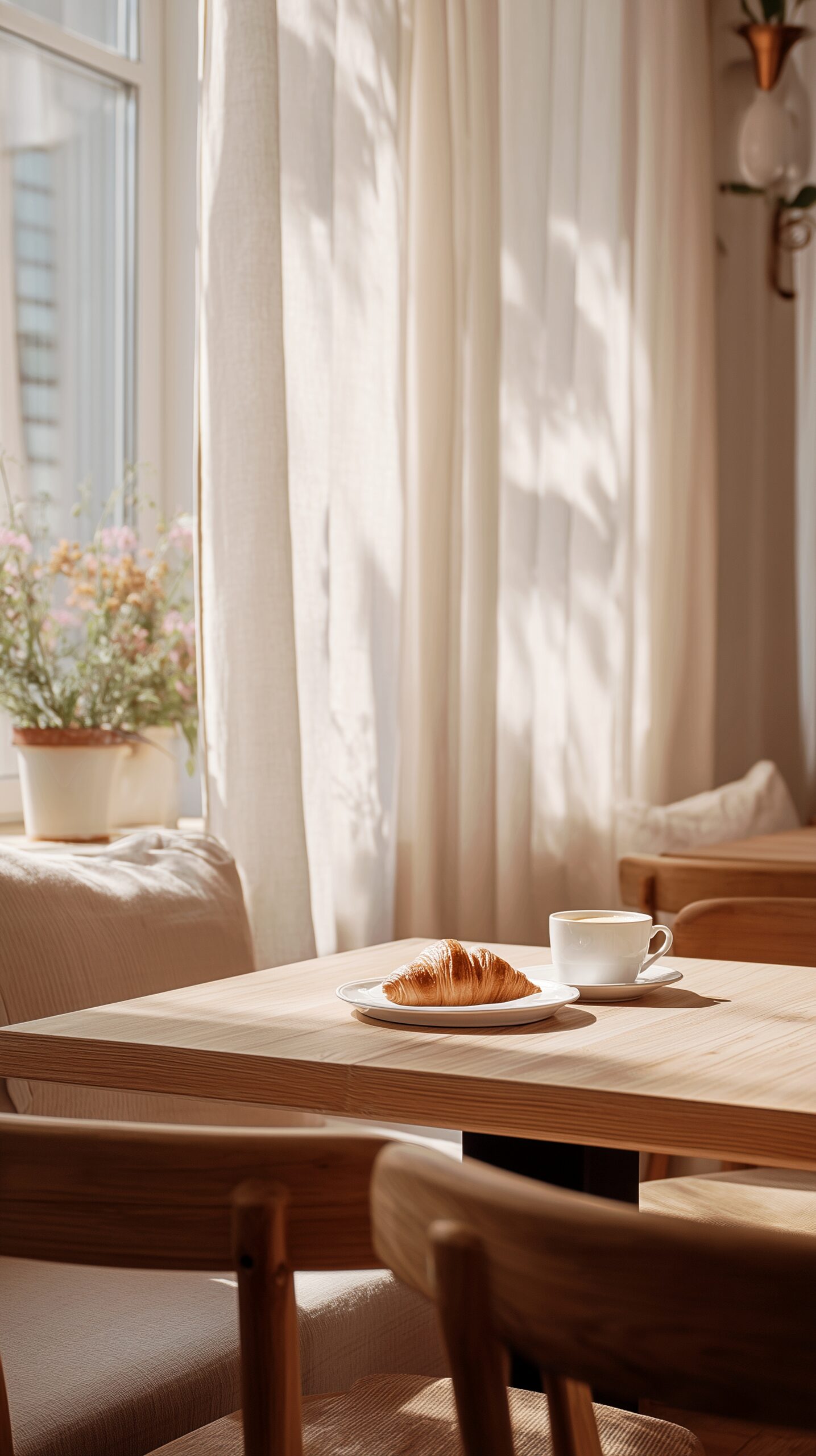 検索タグ:カフェ、インテリア、cafe、interior、店内、飲食店、オシャレ、お洒落、おしゃれ、フリー素材、フリー画像、AI生成画像、コピースペース、テキストスペース、無料画像、カフェテーブル、カフェタイム、縦長、壁紙、ロック画面、スマホ、スマホ壁紙、ショート動画用、縦動画用、iPhone、アイフォン、アイホン、table、テーブル席、喫茶店、食べ物、食事、ホットコーヒー、パン、モーニング、morning、クロワッサン、北欧風、bread、croissant