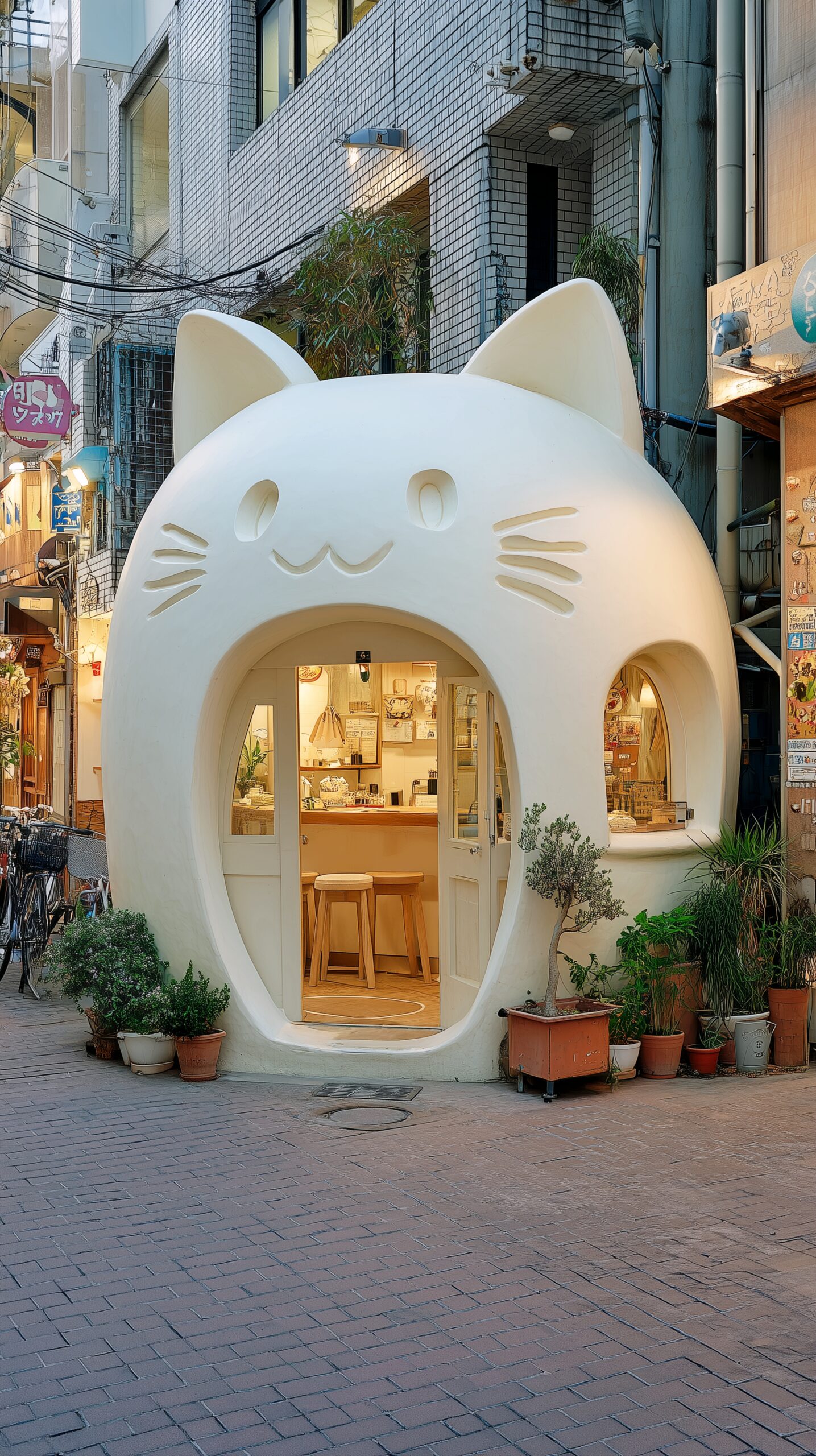 検索タグ:カフェ、cafe、飲食店、オシャレ、お洒落、おしゃれ、外観、お店、外装、店舗、フリー素材、フリー画像、AI生成画像、喫茶店、Store、デザイン、かわいい、可愛い、カワイイ、キュート、cute、イメージ画像、モダン、Design、猫、ネコ、ねこ、猫カフェ、ねこカフェ、ネコカフェ、猫型カフェ、イメージ素材、9:16、待ち受け画像、縦長、wallpaper