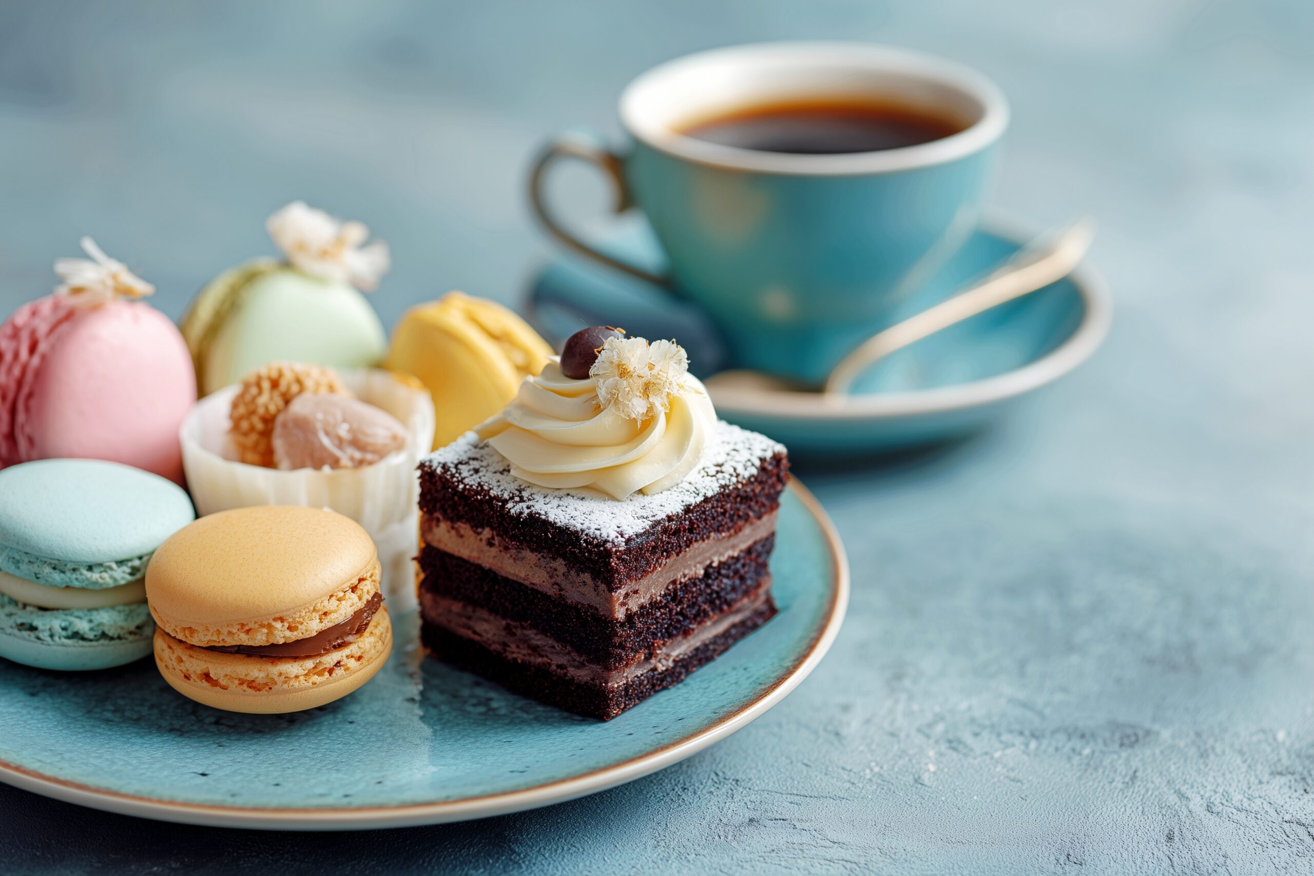 検索タグ:カフェ、cafe、店内、飲食店、オシャレ、お洒落、おしゃれ、テーブル、フリー素材、フリー画像、AI生成画像、食べ物、食事、フード、スイーツ、食事、アフタヌーンティー、デザート、盛り付け、コピースペース、グルメ、メニュー、マカロン