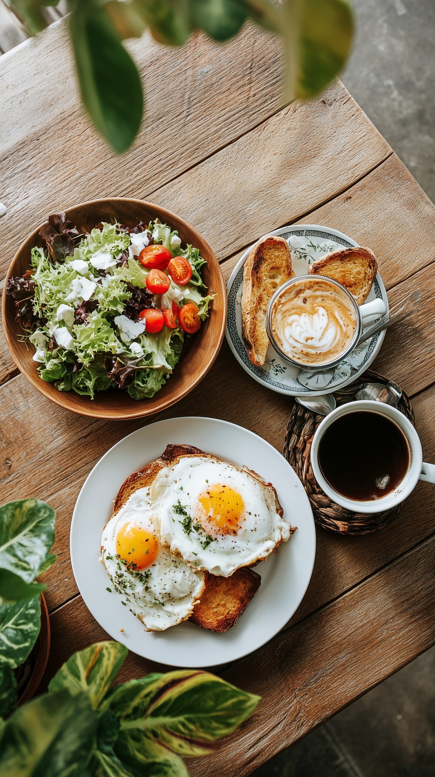 検索タグ:カフェ、cafe、店内、飲食店、オシャレ、お洒落、おしゃれ、テーブル、フリー素材、フリー画像、AI生成画像、ランチ、お昼ごはん、昼ご飯、食べ物、食事、フード、喫茶店、メニュー、モーニング、朝食、朝ごはん、朝ご飯、グルメ、カフェメニュー、カフェご飯、カフェごはん、morning、ホットコーヒー、ブラックコーヒー、hot coffee、珈琲、料理、目玉焼きトースト、食パン、朝メシ、朝飯、朝めし、サラダ