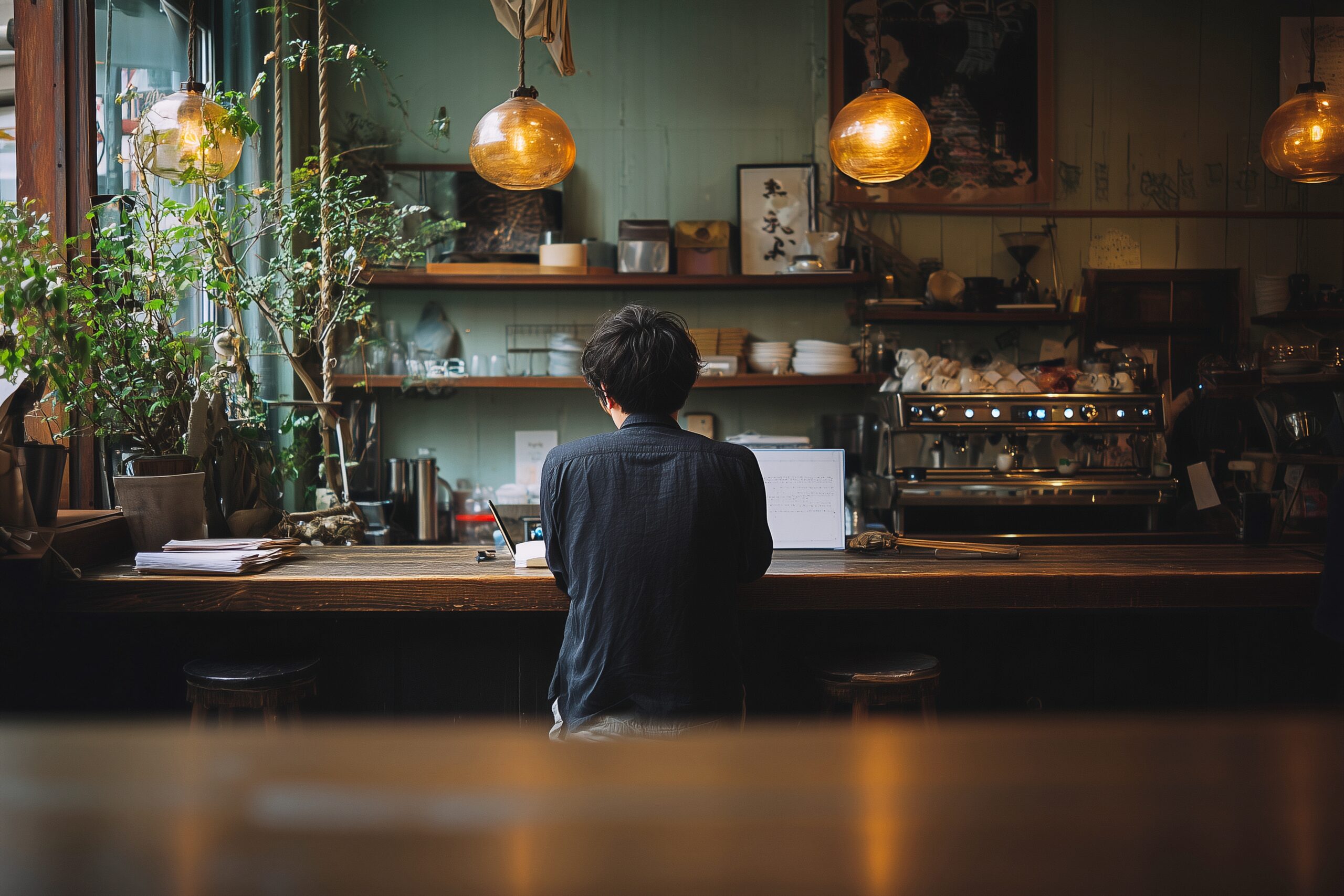 検索タグ:カフェ、cafe、飲食店、オシャレ、お洒落、おしゃれ、お店、店舗、フリー素材、フリー画像、AI生成画像、喫茶店、free image、インテリア、innteria、内装、内観、人物、後ろ姿、男性、フリーランス、男、男の人、後姿、休日、カフェカウンター、仕事、ビジネス、作業、パソコン操作、ビジネスマン、若者、20代、30代