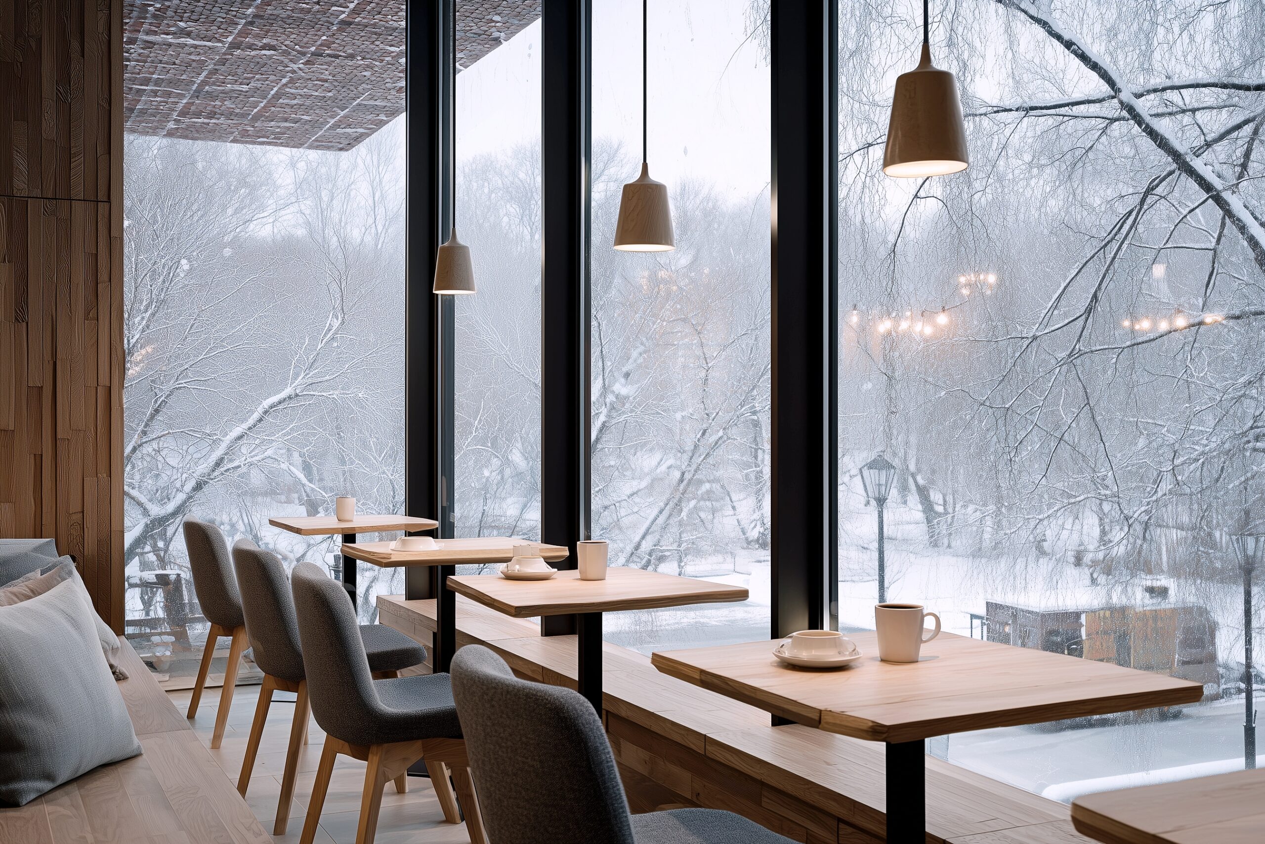 検索タグ:カフェ、cafe、飲食店、オシャレ、お洒落、おしゃれ、建物、建築、お店、店舗、フリー素材、フリー画像、AI生成画像、喫茶店、秋、Autumn、オータム、モダン、季節、free image、インテリア、innteria、内装、内観、背景素材、背景画像、Zoom背景、配信背景、冬、雪、寒い、季節、冬至、雪国、レトロ