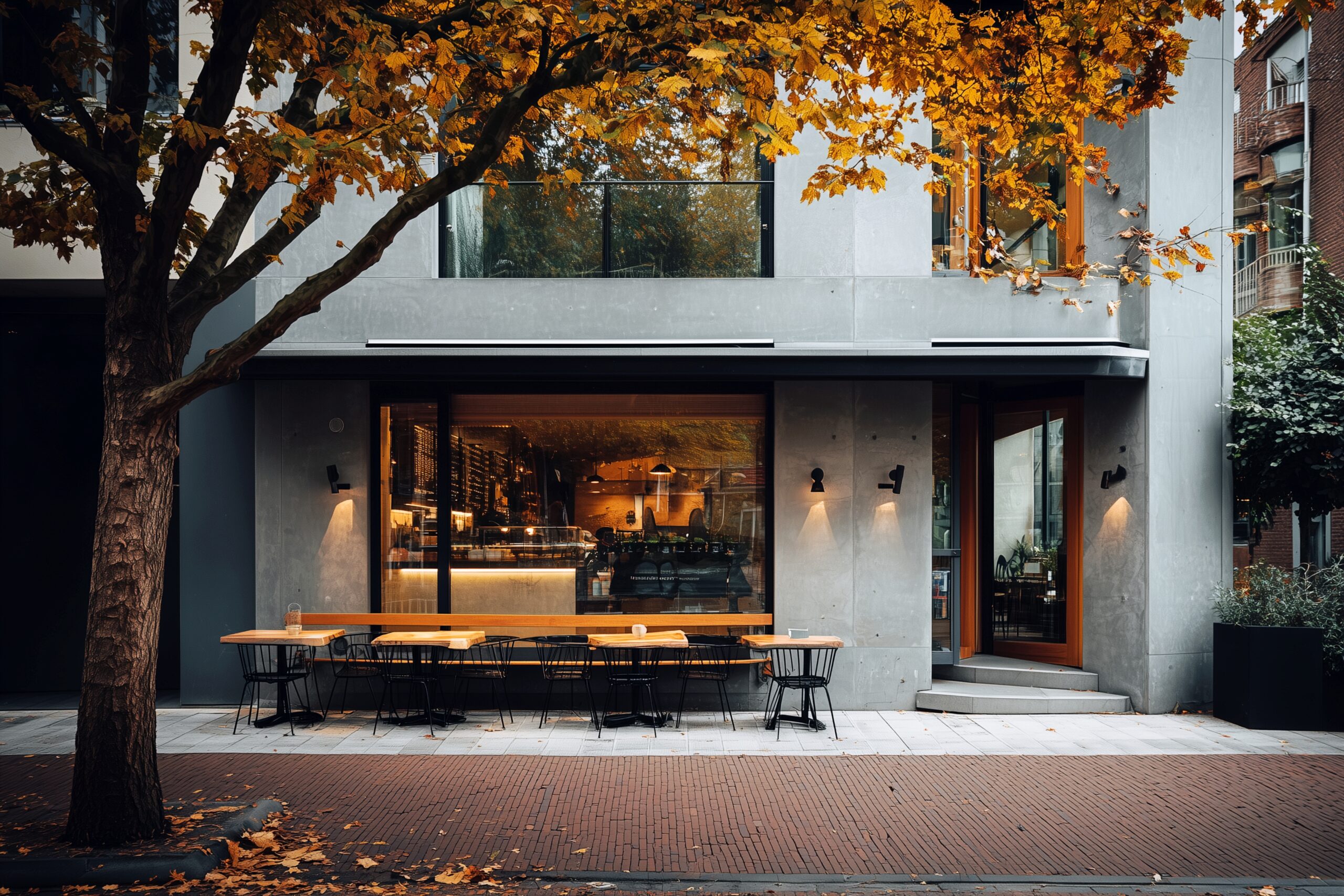 検索タグ:カフェ、cafe、飲食店、オシャレ、お洒落、おしゃれ、外観、建物、建築、お店、店舗、フリー素材、フリー画像、AI生成画像、外装、懐かしい雰囲気、喫茶店、秋、Autumn、オータム、モダン、季節、紅葉、季節、四季