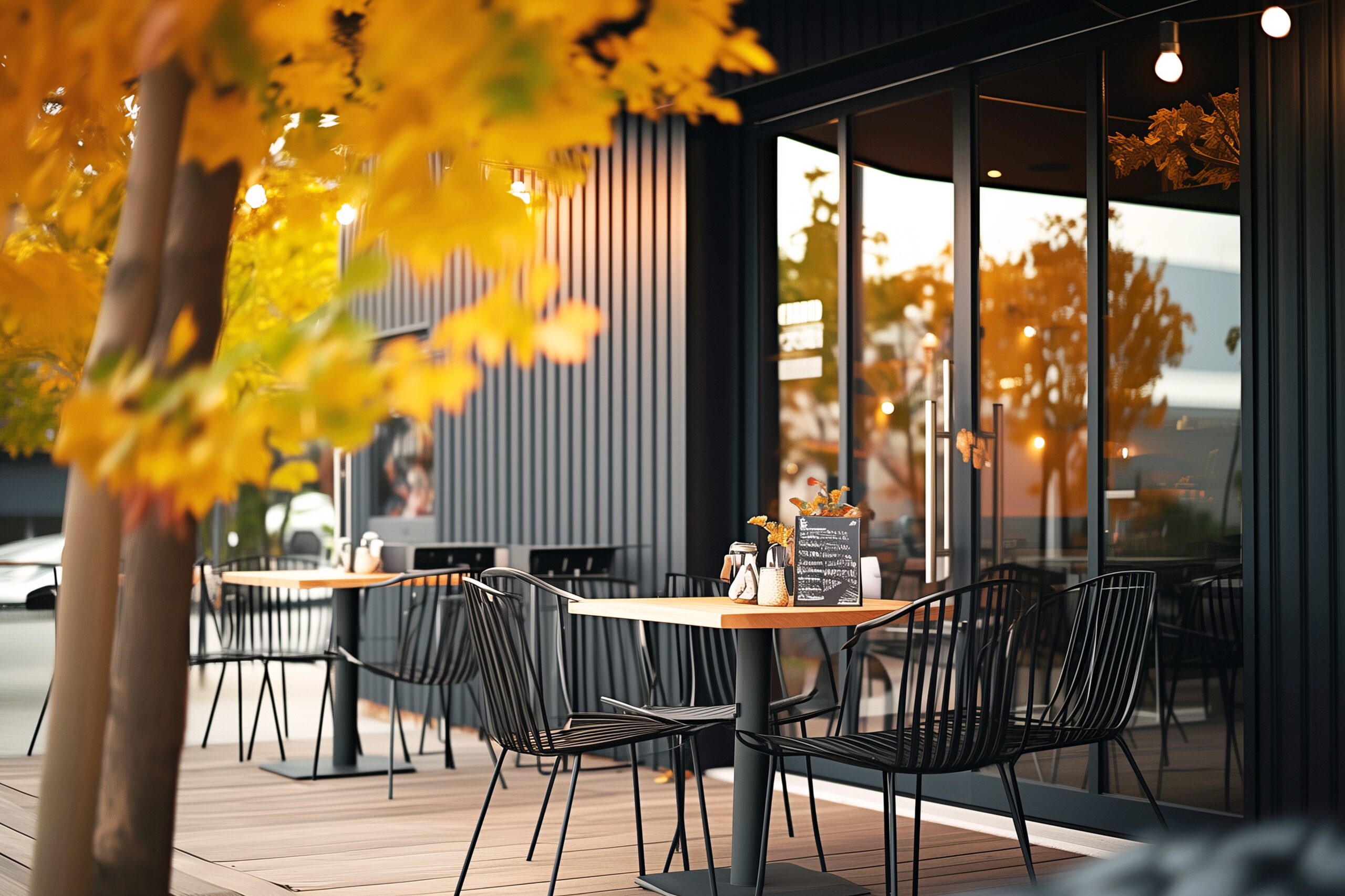 検索タグ:カフェ、cafe、飲食店、オシャレ、お洒落、おしゃれ、外観、建物、建築、お店、店舗、フリー素材、フリー画像、AI生成画像、外装、懐かしい雰囲気、喫茶店、秋、Autumn、オータム、モダン、季節、紅葉、季節、四季