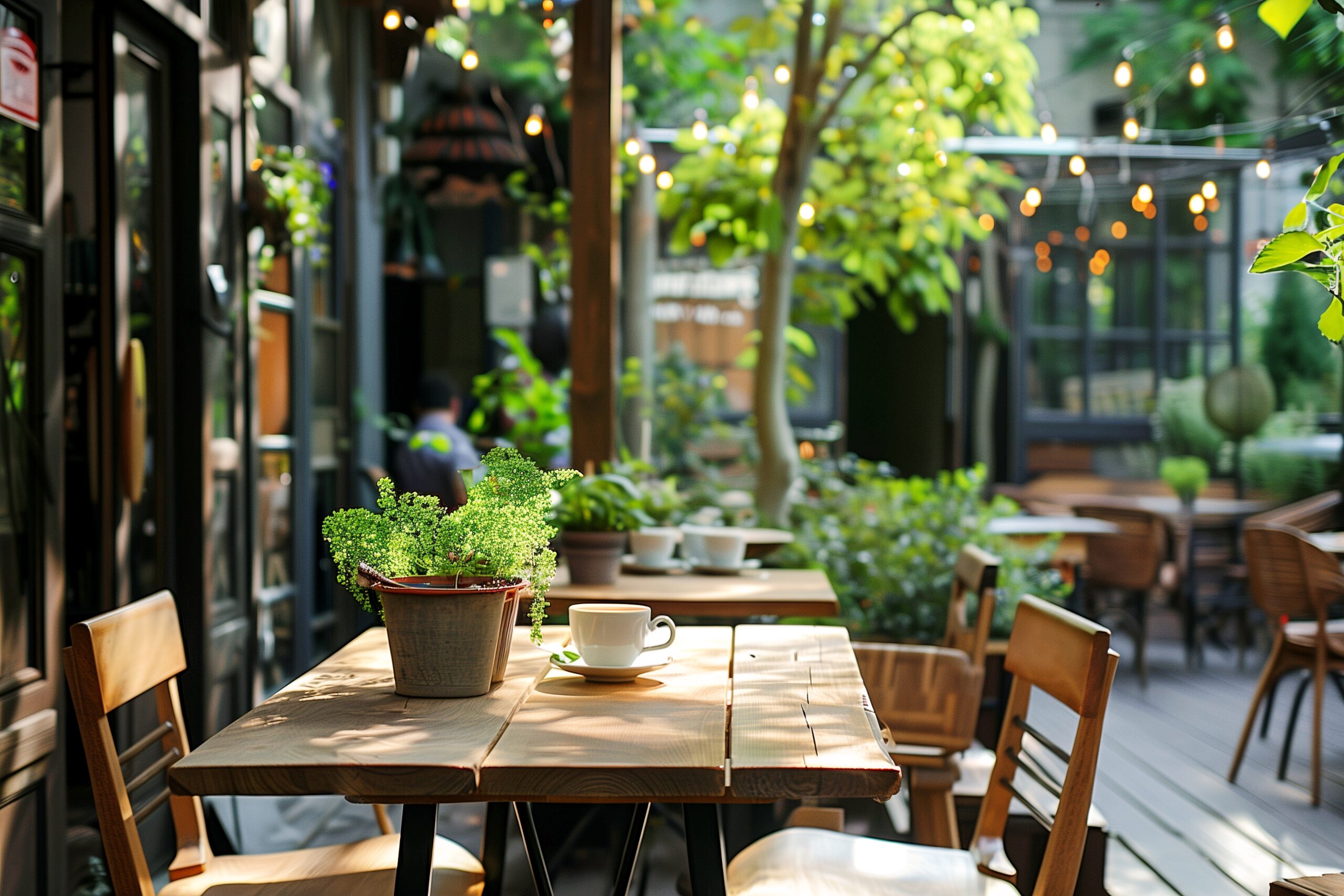検索タグ:カフェ、cafe、飲食店、オシャレ、お洒落、おしゃれ、木のテーブル、フリー素材、フリー画像、AI生成画像、レストラン、カフェテラス、外、アウトドア