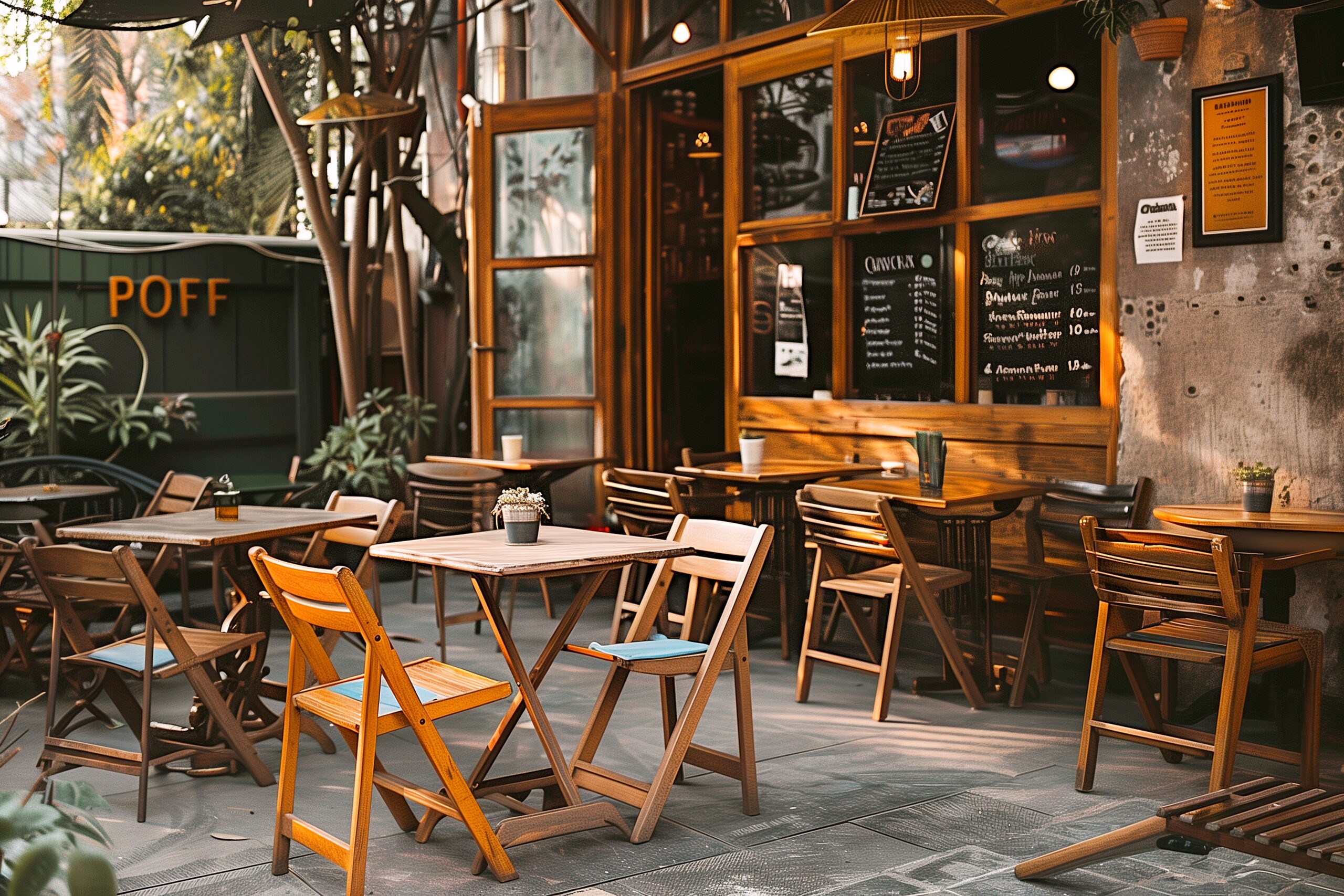 検索タグ:カフェ、cafe、飲食店、オシャレ、お洒落、おしゃれ、木のテーブル、フリー素材、フリー画像、AI生成画像、レストラン、カフェテラス、外、アウトドア