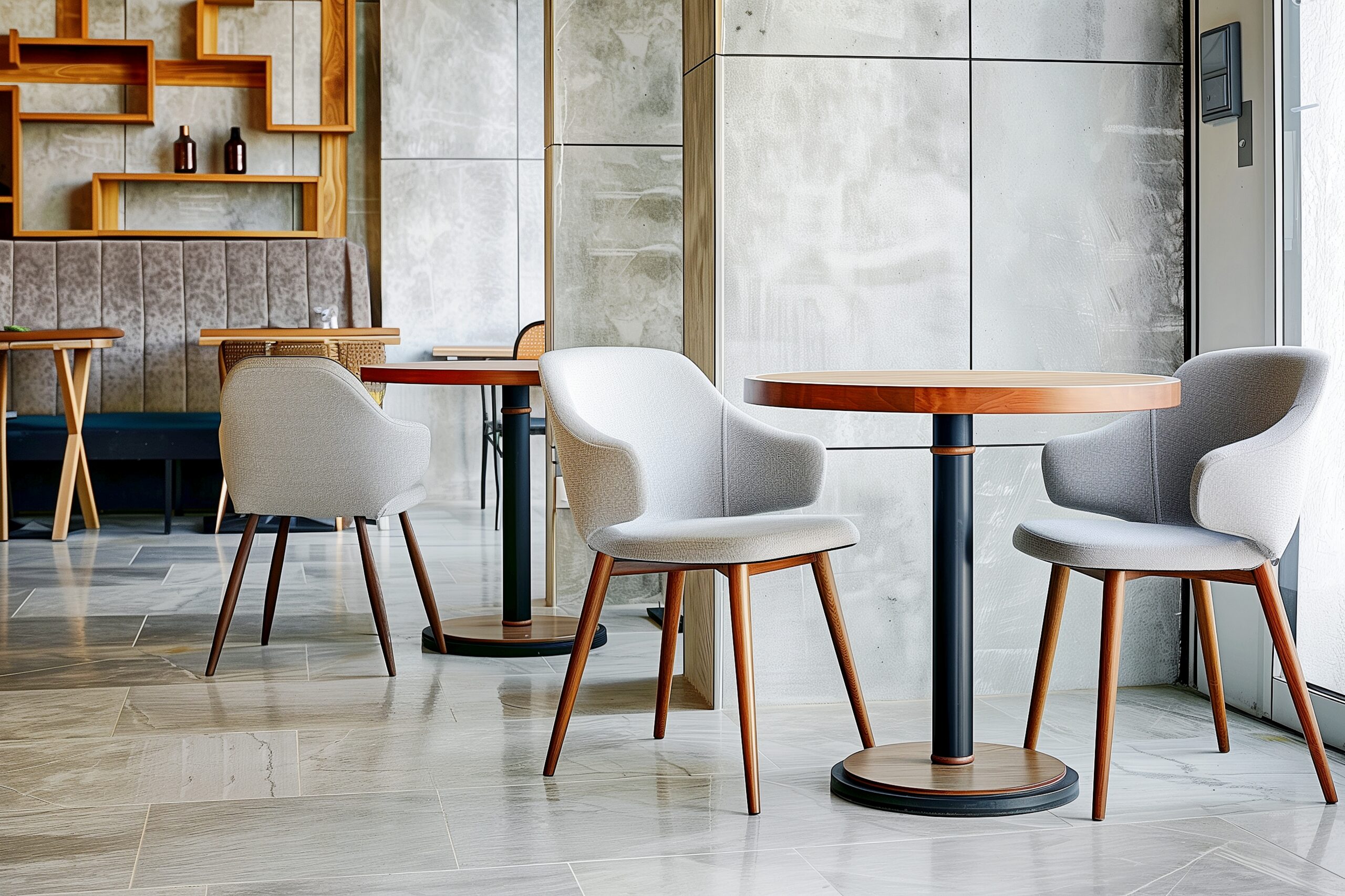 検索タグ:カフェ、インテリア、cafe、interior、店内、飲食店、オシャレ、お洒落、おしゃれ、室内、屋内、内装、内観、フリー素材、フリー画像、AI生成画像、テーブル、椅子、シンプル、コピースペース、モダン、グレー、灰色、シック、落ち着いた雰囲気