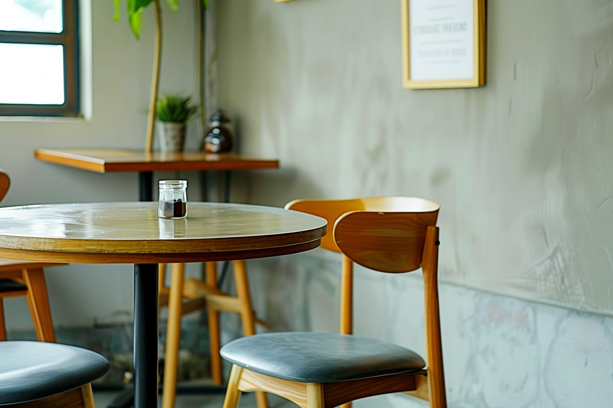 検索タグ:カフェ、インテリア、cafe、interior、店内、飲食店、オシャレ、お洒落、おしゃれ、室内、屋内、内装、内観、フリー素材、フリー画像、AI生成画像、テーブル、椅子、シンプル、コピースペース、モダン、グレー、灰色、シック、落ち着いた雰囲気