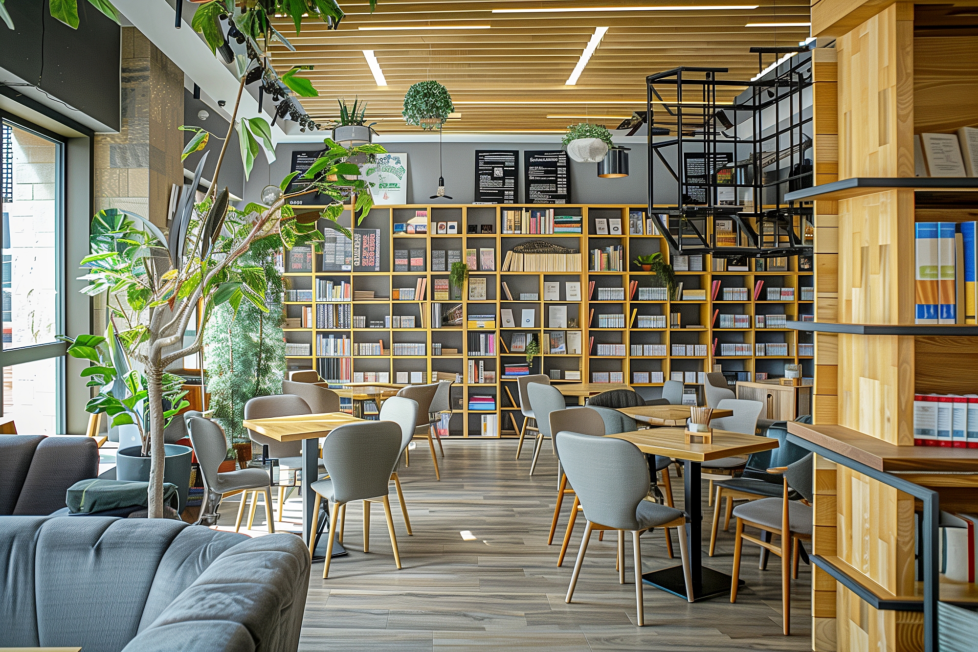 検索タグ:カフェ、インテリア、cafe、interior、店内、飲食店、オシャレ、お洒落、おしゃれ、ブックカフェ、本棚、フリー素材、フリー画像、AI生成画像、内装、内観、室内、店舗、お店、読書、図書館、Book、モダン、壁紙、ZOOM背景、配信用、背景素材、アイキャッチ、サムネイル、喫茶店