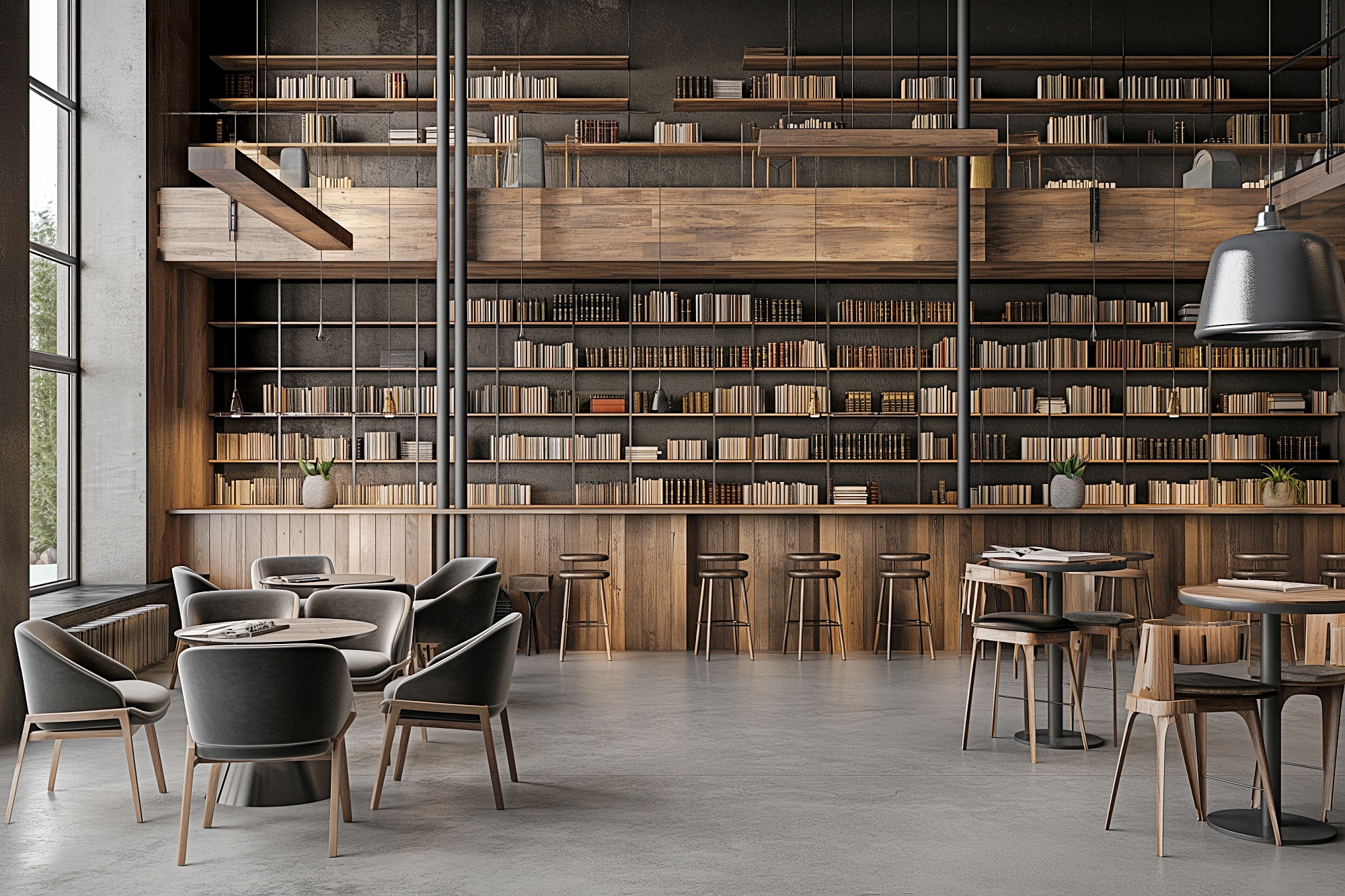 検索タグ:カフェ、インテリア、cafe、interior、店内、飲食店、オシャレ、お洒落、おしゃれ、ブックカフェ、本棚、フリー素材、フリー画像、AI生成画像、内装、内観、室内、店舗、お店、読書、図書館、Book、モダン、壁紙、ZOOM背景、配信用、背景素材、アイキャッチ、サムネイル、喫茶店