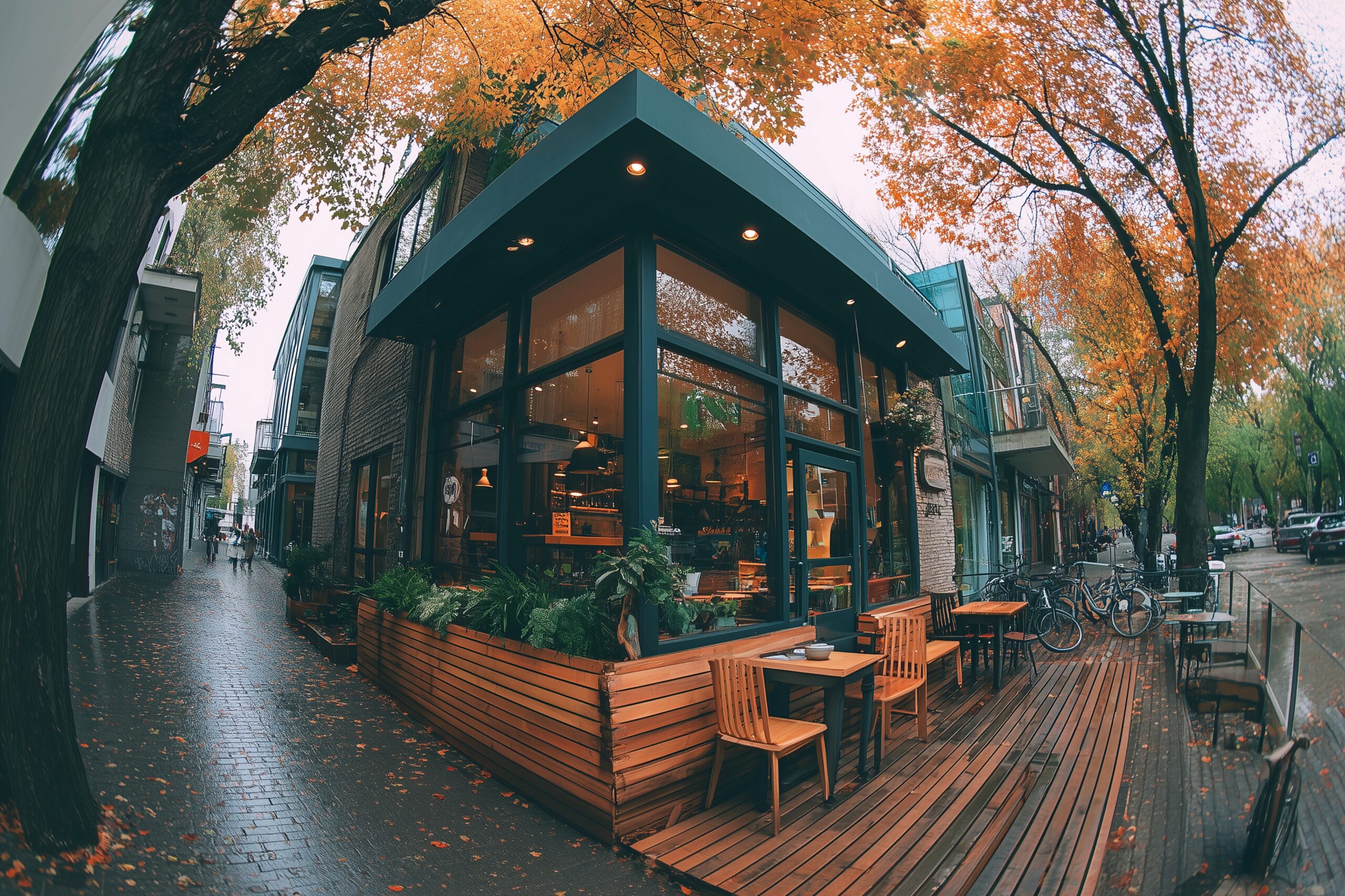 おしゃれなモダンカフェの外観・秋 / フリー素材03