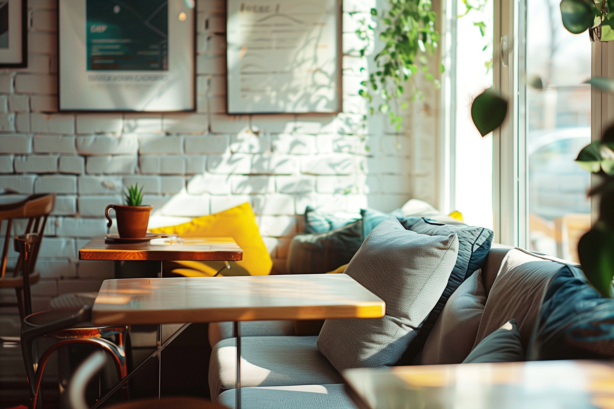 検索タグ:カフェ、インテリア、cafe、interior、店内、飲食店、オシャレ、お洒落、おしゃれ、フリー素材、フリー画像、AI生成画像、内装、内観、室内、店舗、お店、モダン、壁紙、ZOOM背景、配信用、背景素材、アイキャッチ、サムネイル、喫茶店、グレー、ソファ席、家具