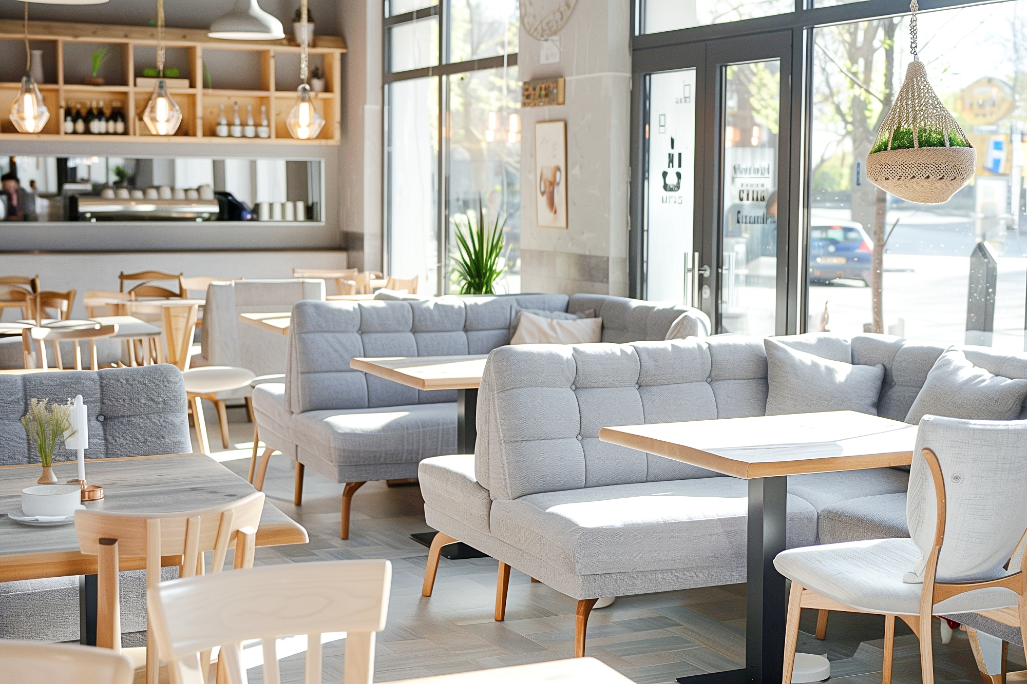 検索タグ:カフェ、インテリア、cafe、interior、店内、飲食店、オシャレ、お洒落、おしゃれ、フリー素材、フリー画像、AI生成画像、内装、内観、室内、店舗、お店、モダン、壁紙、ZOOM背景、配信用、背景素材、アイキャッチ、サムネイル、喫茶店、グレー、ソファ席、家具